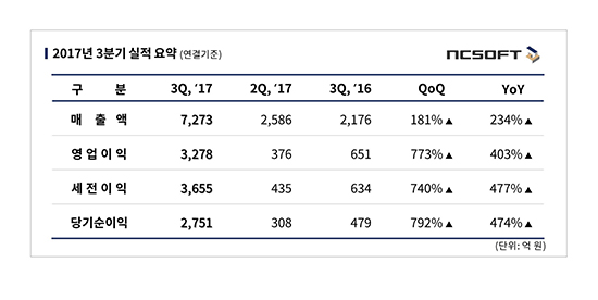 ¿£¾¾¼ÒÇÁÆ®°¡ 2017³â 3ºÐ±â ½ÇÀû °á»ê(¿¬°á±âÁØ) °á°ú ¸ÅÃâ 7,273¾ï ¿ø, ¿µ¾÷ÀÌÀÍ 3,278¾ï ¿ø, ´ç±â¼øÀÌÀÍ 2,751¾ï ¿øÀ» ±â·ÏÇß´Ù. Àü³â µ¿±â´ëºñ ¸ÅÃâ°ú ¿µ¾÷ÀÌÀÍÀº 234%, 403%, ´ç±â¼øÀÌÀÍÀº 474% Áõ°¡Çß´Ù. ÀüºÐ±â ´ëºñ ¸ÅÃâ, ¿µ¾÷ÀÌÀÍ, ´ç±â¼øÀÌÀÍÀº °¢°¢ 181%, 773%, 792% »ó½ÂÇß´Ù. ºÐ±â ¸ÅÃâÀ» Áö¿ªº°·Î »ìÆìº¸¸é, Çѱ¹ 6,310¾ï ¿ø, ºÏ¹Ì/À¯·´ 323¾ï ¿ø, ÀϺ» 104¾ï ¿ø, ´ë¸¸ 99¾ï ¿øÀÌ´Ù. ·Î¿Æ¼ ¸ÅÃâÀº 436¾ï ¿øÀÌ´Ù. Á¦Ç° º°·Î´Â ¸®´ÏÁö 354¾ï ¿ø, ¸®´ÏÁö2 156¾ï ¿ø, ¾ÆÀ̿ 102¾ï ¿ø, ºí·¹À̵å & ¼Ò¿ï 380¾ï ¿ø, ±æµå¿ö2 201¾ï ¿ø, ¸ð¹ÙÀϰÔÀÓ 5,510¾ï ¿øÀ¸·Î Áý°èµÆ´Ù. ÀüºÐ±â ´ëºñ ¸ð¹ÙÀϰÔÀÓ ¸ÅÃâÀº 488%, ·Î¿Æ¼ ¸ÅÃâÀº 21% ¼ºÀåÇß´Ù. ±æµå¿ö2´Â µÎ ¹øÂ° È®ÀåÆÑ ¡®ÆÐ½º¿ÀºêÆÄÀ̾î(Path of Fire)¡¯ÀÇ Ãâ½Ã ¿µÇâÀ¸·Î ÀüºÐ±â ´ëºñ 49%, Àü³âµ¿±â ´ëºñ 32%ÀÇ ¸ÅÃâ »ó½ÂÀ» ±â·ÏÇß´Ù. ¿£¾¾¼ÒÇÁÆ®´Â 11¿ù 7ÀÏ ½ÅÀÛ ¹ßǥȸ¿¡¼ Â÷±âÀÛÀÎ ÇÁ·ÎÁ§Æ® TL, ¸®´ÏÁö2M, ¾ÆÀ̿ ÅÛÆä½ºÆ®, ºí·¹À̵å& ¼Ò¿ï 2¸¦ °ø°³Çß´Ù. ÀÌµé ½ÅÀÛ °ÔÀÓµéÀ» 2018³âºÎÅÍ ¼øÂ÷ÀûÀ¸·Î ¼±º¸ÀÏ °èȹÀÌ´Ù