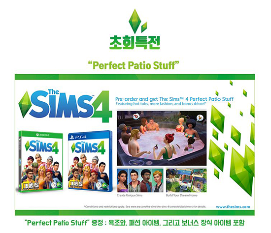 '´õ ½ÉÁî 4 (The Sims¢â 4)'PlayStation¢ç4/XBOX ONE ¹öÀüÀÇ ÃÊȸ ƯÀüÀ¸·Î´Â ¿åÁ¶¿Í, ÆÐ¼Ç¾ÆÀÌÅÛ, ±×¸®°í º¸³Ê½º Àå½Ä ¾ÆÀÌÅÛÀ¸·Î ±¸¼ºµÈ ¡°The Sims¢â 4 Perfect Patio Stuff¡±°¡ Á¦°øµÉ ¿¹Á¤ÀÌ´Ù. ÃÊȸƯÀü ¡°The Sims¢â 4 Perfect Patio Stuff¡±