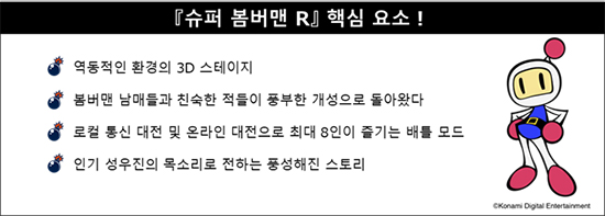º½¹ö¸Ç ½Ã¸®Áî´Â 1983 ³âºÎÅÍ ¶Ù¾î³ ¸ÖƼ Ç÷¹ÀÌ ¾×¼ÇÀ¸·Î ÆÒµé¿¡°Ô Áñ°Å¿òÀ» ¼±»çÇØ ¿Ô´Ù. ±âº» ½Ã½ºÅÛÀº ¼±ÅÃÇÑ º½¹ö¸ÇÀ» ¿òÁ÷¿© ¹Ì·Î¿Í °°Àº °ÔÀÓ °ø°£ ¼Ó¿¡¼ ½ÃÇÑ ÆøÅºÀ¸·Î Åë·Î¸¦ ¿°í ´Ù¸¥ Ç÷¹À̾ CPU °¡ Á¶Á¾ÇÏ´Â ÀûÀ» ¹°¸®Ãļ ½ºÅ×ÀÌÁö¸¦ Ŭ¸®¾îÇÏ´Â ¹æ½ÄÀÌ´Ù. ½ÅÀÛ ¡°½´ÆÛ º½¹ö¸Ç R¡±Àº ÀÌ·¯ÇÑ ÇÙ½É ¿ä¼Ò¸¦ À̾î¹Þ¾Æ, ½Ã¸®ÁîÀÇ °ÔÀÓ¼º°ú Á¶ÀÛ°¨Àº ±×´ë·Î »ì¸®¸é¼ º¸´Ù °¨°¢ÀûÀÎ ºñÁÖ¾ó·Î ¾÷±×·¹ÀÌµå µÇ¾î µ¹¾Æ ¿Ô´Ù. ¡®½´ÆÛ º½¹ö¸Ç R¡¯Àº ´ÑÅÙµµ ½ºÀ§Ä¡ ½Ã½ºÅÛ ±â´ÉÀ» ÃÖ´ëÇÑ È°¿ëÇÏ¿© Ç÷¹À̾ ¾ðÁ¦ ¾îµð¼³ª ÀÚ½ÅÀÌ ¼±ÅÃÇÑ »ç¶÷µé°ú ÇÔ²² °ÔÀÓÀ» Áñ±æ ¼ö ÀÖ´Ù. ÃÖ´ë 8 ¸íÀÇ Ç÷¹À̾ ¹Ì·Î¿¡ ¶³¾îÁ® £§¸¶Áö¸· ³²Àº ÇÑ »ç¶÷£§ÀÌ ½Â¸®ÇÒ ¶§±îÁö ÁøÇàµÇ´Â ¡®¹èƲ ¸ðµå¡¯ ¿Í ÀºÇϸ¦ ±¸Çϱâ À§ÇØ 1 ~ 2 ¸íÀÇ Ç÷¹À̾ Çù·ÂÇÏ¿© 50°³ÀÇ ½ºÅ×ÀÌÁö¸¦ Ŭ¸®¾îÇØ ³ª°¡´Â '½ºÅ丮 ¸ðµå¡¯µµ ÀÖ´Ù. °¢ ¹Ì·ÎÀÇ ÆÄ±« °¡´ÉÇÑ ¿µ¿ª¿¡¼ ãÀ» ¼ö ÀÖ´Â À¯¿ëÇÑ ¾ÆÀÌÅÛÀ» Æ÷ÇÔÇÑ º½¹ö¸ÇÀÇ ÁÖ¿ä ¿ä¼Ò°¡ ÀüºÎ ´ÑÅÙµµ ½ºÀ§Ä¡ ŸÀÌÆ²·Î ±¸ÇöµÇ¾ú´Ù. ÆøÆÄ°¡´ÉÇÑ ºí·ÏÀ» Á¦°ÅÇϸé, Æø¹ß ¹üÀ§¸¦ È®ÀåÇÏ´Â ¾ÆÀÌÅÛÀ» ºñ·ÔÇÏ¿©, »¡¸® ¿òÁ÷À̰ųª, ÆøÅºÀ» °È¾îÂ÷°Å³ª ´øÁú ¼ö ÀÖ´Â ´É·Â µî º½¹ö¸Ç¿¡°Ô À¯¿ëÇÑ ±â¼úÀ» ºÎ¿©ÇÏ´Â ÆÄ¿ö ¾÷ ¾ÆÀÌÅÛÀÌ ³ªÅ¸³ª¸ç À̸¦ ÅëÇØ ´õ¿í °·ÂÇÑ ´É·ÂÀ» ¾ò°í, ¸ðµç ½ºÅ³°ú ÀåÄ¡¸¦ Àû±ØÀûÀ¸·Î »ç¿ëÇÏ¿© »ó´ë¹æÀÌ ÆøÅºÀ» ÇÇÇÏ´Ù Æø¿°¿¡ ÈÛ½ÎÀÌ°Ô ¸¸µé ¼ö ÀÖ´Ù! ¶ÇÇÑ ¡®½´ÆÛ º½¹ö¸Ç R¡¯¿¡¼´Â Ç÷¹ÀÌ Áß¿¡ ȹµæÇÑ ¹«·á ¡®º¸¼®£§À» »ç¿ëÇÏ¿© ´Ù¾çÇÑ Á¾·ùÀÇ Àç¹ÌÀÖ´Â ¾×¼¼¼¸®¸¦ Ãß°¡ ÇÒ ¼ö ÀÖ´Â °ÔÀÓ ³» »óÁ¡À» Á¦°øÇÑ´Ù. (¿¹: ¼Ò¶ó²®Áú µî°ú °°Àº ¸Ó¸® Àå½Ä ¹× ¸ðÀÚ, µ¶Æ¯ÇÑ ÆøÅºÀÇ »õ·Î¿î ij¸¯ÅÍ, ±×¸®°í Æ®·³Æç¸°À̳ª ¹«ºê ÇÃ·Î¾î µî)