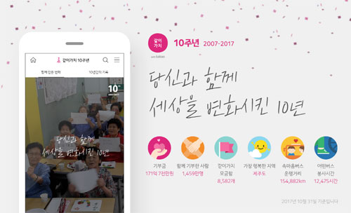 2007³â ¡®Daum Èñ¸Á¸ð±Ý¡¯ À¸·Î ½ÃÀÛÇØ ±¹³» ÃÖÃÊ·Î ´©±¸¿¡°Ô³ª ¸ð±ÝÀ» Á¦¾ÈÇÒ ¼ö ÀÖ´Â ±âȸ¸¦ Á¦°øÇÔÀ¸·Î½á ±âºÎ ¹®ÈÀÇ ÆÐ·¯´ÙÀÓÀ» ¡®ÀÚ¹ßÀû Âü¿©¡¯ ¶ó´Â ¸ðÅä·Î ¹Ù²Ù°íÀÚ ³ë·ÂÇØ ¿ÔÀ¸¸ç, 2016³â 3¿ù '°°À̰¡Ä¡ with Kakao¡¯ ·Î °³ÆíÇØ ¿ÃÇØ·Î 10³âÀ» ¸Â¾Ò´Ù.