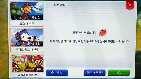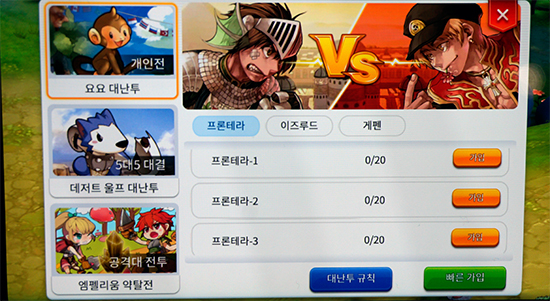 PvP ½Ã½ºÅÛÀº °³ÀÎÀüÀÎ ¡®¿ä¿ä ´ë³Åõ¡¯, 5´ë5 ´ë°áÀÎ ¡®µ¥ÀúÆ® ¿ïÇÁ ´ë³Åõ¡¯, °ø°Ý´ë ´ë±Ô¸ð ³ÅõÀÎ ¡®¿¥Æç¸®¿ò ¾àÅ»Àü¡¯ µîÀ¸·Î ³ª´µ¾î ÀÖ¾ú´Ù. ´ëÀü ¸Þ´º¿¡¼ ºÐ¾ßº°·Î ¼Õ½±°Ô Âü°¡ÇÒ ¼ö ÀÖ¾ú´Ù.