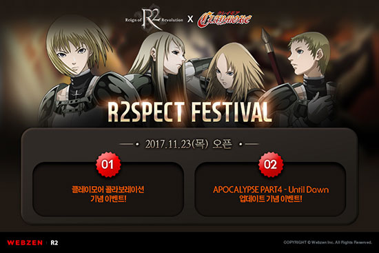 À¥Á¨ÀÇ PC MMORPG 'R2(Reign of Revolution)'°¡ ½Å±Ô ¾÷µ¥ÀÌÆ®¸¦ ÁøÇàÇÏ°í ´ë±Ô¸ð À̺¥Æ® ¡®R2SPECT FESTIVAL¡¯À» °ø°³ÇÑ´Ù. À¥Á¨Àº ¿À´Ã(11¿ù 23ÀÏ) 'R2'ÀÇ ¾÷µ¥ÀÌÆ® Á¡°Ë½Ã°£À» °®°í, Àü ¼¹ö ÀÌ¿ëÀÚ°¡ °æÀïÇÒ ¼ö ÀÖ´Â ½Å±Ô ¿µÁö 'µ¥¸ðÀÚ¸£ ¼¶'°ú ij¸¯ÅÍÀÇ °íÀ¯ ½ºÅ³À» °ÈÇÏ´Â '½Å±Ô Ư¼º °È ½ºÅ³' µîÀ» Ãß°¡ÇÏ´Â ¾÷µ¥ÀÌÆ® 'APOCALYPSE Part4-Until Dawn'À» Àû¿ëÇÑ´Ù. À¥Á¨Àº À̹ø ¾÷µ¥ÀÌÆ®¿¡¼ R2ÀÇ ½ºÇÇµå ¼¹ö¸¦ Á¦¿ÜÇÑ ¸ðµç ¼¹ö¿¡ À¯¸í ¾Ö´Ï¸ÞÀÌ¼Ç 'Ŭ·¹À̸ð¾î'ÀÇ ÁÖ¿ä ij¸¯Å͵éÀ» ¼±º¸ÀδÙ. °ÔÀ̸ӵéÀº ÁÖÀΰø ¡®Å¬·¹¾î¡¯¸¦ Æ÷ÇÔÇÑ Àαâ ij¸¯ÅÍ 5Á¾À¸·Î Á÷Á¢ º¯½ÅÇØ »ç³É°ú ÀüÅõ¸¦ Áñ±â´Â µî »ö´Ù¸¥ ¸ð½ÀÀÇ Ä³¸¯Å͸¦ ¸¸³ªº¼ ¼ö ÀÖ´Ù. À¥Á¨Àº ½Å±Ô ¾÷µ¥ÀÌÆ®¸¦ ±â³äÇØ 12¿ù 7ÀϱîÁö Ŭ·¹À̸ð¾î ÃÖ°ÀÇ Ä³¸¯ÅÍÀÎ 'Å×·¹»ç'ÀÇ º¯½ÅÀ» °¡Àå ¸ÕÀú ȹµæÇÑ 1¸íÀÇ È¸¿øÀ» ¼¹öº°·Î ¼±Á¤ÇØ '10¸¸ À̺¥Æ® ij½Ã'¸¦ º¸»óÀ¸·Î Áö±ÞÇÑ´Ù. ¶ÇÇÑ 12¿ù 14ÀϱîÁö °ÔÀÓ¿¡ Á¢¼ÓÇÑ ½Ã°£¿¡ µû¶ó 1½Ã°£¸¶´Ù '¹«¼±Ã»¼Ò±â', '°ÔÀÌ¹Ö Å°º¸µå' µî °æÇ°¿¡ ÀÀ¸ðÇÒ ¼ö ÀÖ´Â Æ÷ÀÎÆ®¸¦ Á¦°øÇϰí, ½Å±Ô Áö¿ª 'µ¥¸ðÀÚ¸£ ¼¶'¿¡ ÀÔÀåÇØ ÁÖ¾îÁø ÀÓ¹« 3°¡Áö¸¦ ¿Ï·áÇÏ¸é °í±Þ °ÔÀÓ¾ÆÀÌÅÛÀ» ¼±¹°ÇÑ´Ù. À̿ܿ¡µµ °ÔÀ̸ӵéÀº 12¿ù 21ÀϱîÁö R2ÀÇ '¾Ö½¬¹ø ¸¶À»'¿¡¼ Äù½ºÆ® º¸»óÀ¸·Î 'Ŭ·¹À̸ð¾î º¯½Å ½ºÅ³ºÏ'À» ȹµæÇÑ ÈÄ °¢ º¯½Å¿¡ ÇÊ¿äÇÑ ´Ù»öÄ«µå¸¦ ¼öÁýÇØ º¯½Å ŸÀÌÆ²À» Ȱ¼ºÈÇÒ ¼ö ÀÖ´Ù. ƯÈ÷ 'Ŭ·¹¾î ¿µÈ¥¼®'À» ¸ð¾Æ º¯½Å °È¸¦ °ÅÄ¡¸é Ŭ·¹À̸ð¾îÀÇ °¡Àå °·ÂÇÑ Àü»ç 'Å×·¹»ç'ÀÇ º¯½Å ½ºÅ³À» ȹµæÇÒ ¼ö ÀÖ´Ù. ÇÑÆí, À¥Á¨Àº ¿À´Ã(11¿ù 23ÀÏ) ¿ÀÈÄ 8½ÃºÎÅÍ ½Å±Ô Æ¯È ¼¹ö 'Ŭ·¹¾î'¸¦ Ãß°¡Çϰí, 12¿ù 4ÀϱîÁö ÇØ´ç ¼¹ö¿¡¼ ij¸¯ÅÍ Àåºñ °È¿¡ ¼º°øÇÑ È¸¿øµéÀ» ´ë»óÀ¸·Î 'ÀÎþƮ Àåºñ 1+1 Áö±Þ À̺¥Æ®'¸¦ ÁøÇàÇÑ´Ù. À¥Á¨Àº À̺¥Æ® Á¾·á ½ÃÁ¡¿¡ °ÔÀ̸Ӱ¡ º¸À¯Çϰí ÀÖ´Â Àåºñ Áß °Èµµ°¡ °¡Àå ³ôÀº Àåºñ¿Í µ¿ÀÏÇÑ ¾ÆÀÌÅÛ 1°³¾¿À» Ãß°¡·Î Áö±ÞÇϰí, 12¿ù 14ÀϱîÁö ¼¹ö ³» ÃÖ°í ·¹º§À» ´Þ¼ºÇÑ Å¬·¡½ºº° »óÀ§ 5¸íÀÇ È¸¿ø¿¡°Ô ÃÖ´ë '°ÈµÈ žç Àå½Å±¸ ¼¼Æ®(7ÀÏ)' µîÀ» ¼±¹°ÇÑ´Ù. À¥Á¨ ¡®R2¡¯ÀÇ ´ë±Ô¸ð ¾÷µ¥ÀÌÆ® ¹× ¡®R2SPECT FESTIVAL¡¯ À̺¥Æ®¿¡ ´ëÇÑ º¸´Ù ÀÚ¼¼ÇÑ ³»¿ëÀº R2 À̺¥Æ®ÆäÀÌÁö(http://r2.webzen.co.kr/events/eleventh/gate)¿¡¼ È®ÀÎÇÒ ¼ö ÀÖ´Ù.