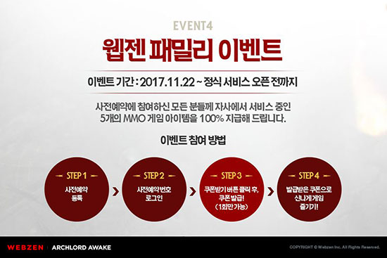 À¥Á¨ÀÌ ½ÅÀÛ ¸ð¹ÙÀÏ MMORPG ¡®¾ÆÅ©·Îµå ¾î¿þÀÌÅ©(ARCHLORD AWAKE)¡¯¿Í ÀÚ»ç °ÔÀÓµé °£ÀÇ Á¦ÈÞ À̺¥Æ®¸¦ ÁøÇàÇÑ´Ù. À¥Á¨Àº 12¿ù 11ÀϱîÁö '¾ÆÅ©·Îµå ¾î¿þÀÌÅ©'¿Í ¡®¹Â(MU)¡¯ ½Ã¸®Áî °ÔÀÓ µî À¥Á¨ °ÔÀÓ 5Á¾ÀÇ ¡®À¥Á¨ ÆÐ¹Ð¸® À̺¥Æ®¡¯¸¦ ÁøÇàÇϰí, ½Å±Ô ȸ¿øµéÀ» ºñ·ÔÇÑ ÀÚ»ç °ÔÀÓµéÀÇ ±âÁ¸ ȸ¿øµéÀ» ´ë»óÀ¸·Î °ÔÀÓ ¾Ë¸®±â¿¡ ³ª¼¹´Ù. À¥Á¨Àº '¾ÆÅ©·Îµå ¾î¿þÀÌÅ©'ÀÇ »çÀü¿¹¾à¿¡ Âü¿©ÇÑ ÀÌ¿ëÀڵ鿡°Ô ÀÚ»çÀÇ PC ¿Â¶óÀΰÔÀÓµé(¡®¹Â ·¹Àüµå¡¯, ¡®¹Â ¿Â¶óÀΡ¯, ¡®¹Â À̱״ϼǡ¯, ¡®R2¡¯)°ú ¸ð¹ÙÀϰÔÀÓ ¡®¹Â ¿À¸®Áø¡¯¿¡¼ »ç¿ëÇÒ ¼ö ÀÖ´Â °ÔÀÓ ÀçÈ ¹× ¾ÆÀÌÅÛÀ¸·Î ±¸¼ºµÈ ÄíÆùÀ» Áö±ÞÇÑ´Ù. À¥Á¨ 5Á¾ÀÇ °ÔÀÓ Áß Èñ¸ÁÇÏ´Â °ÔÀÓÄíÆùÀ» ȹµæÇÏ·Á¸é °ÔÀÓÀÇ »çÀü¿¹¾à »çÀÌÆ®¿¡¼ µî·ÏÀ» ¿Ï·áÇØ¾ß ÇÑ´Ù. µî·ÏÇÑ ÈÞ´ëÀüÈ ¹øÈ£·Î ·Î±×ÀÎÇÑ ÈÄ ¿øÇÏ´Â °ÔÀÓÀ» ¼±ÅÃÇÏ¸é ¹Ù·Î »ç¿ëÇÒ ¼ö ÀÖ´Â ÄíÆùÀÌ ¹ß±ÞµÈ´Ù. À¥Á¨Àº À̹ø Á¦ÈÞ À̺¥Æ®·Î ¹Â(MU) ½Ã¸®Áî °ÔÀÓÀ» Ç÷¹ÀÌÇϰí ÀÖ´Â ±âÁ¸ °ÔÀ̸ӵéÀº ¹°·Ð, ½Å±Ô °ÔÀ̸ӵ鿡°Ôµµ '¾ÆÅ©·Îµå ¾î¿þÀÌÅ©'¸¦ ºñ·ÔÇØ ÀÚ»çÀÇ ´Ù¾çÇÑ °ÔÀÓÀ» Áñ±æ ¼ö ÀÖ´Â ±âȸ¸¦ Á¦°øÇÒ °èȹÀÌ´Ù. ÇÑÆí, '¾ÆÅ©·Îµå ¾î¿þÀÌÅ©'´Â 12¿ù 12ÀÏ Á¤½Ä¼ºñ½º ½ÃÀÛÀ» ¾ÕµÎ°í ±¸±Û Ç÷¹À̽ºÅä¾î¿¡¼ »çÀü¿¹¾àÀ» ÁøÇàÇϰí ÀÖÀ¸¸ç, ÀÌ¿ëÀڵ鿡°Ô Ãâ½Ã¸¦ ¾ÕµÐ ½Å±Ô °ÔÀÓÀ» ÃßõÇÏ´Â ±¸±Û ¾Û ¸¶Äϳ» 'ÇÇóµå'·Î ¼±Á¤µÇ¸é¼ °ÔÀÓ¼º°ú ÈÁ¦¼ºÀ» ÀÎÁ¤¹Þ¾Ò´Ù. '¾ÆÅ©·Îµå ¾î¿þÀÌÅ©'´Â ¿øÀÛ PC ¿Â¶óÀΰÔÀÓ ¡®¾ÆÅ©·Îµå¡¯¸¦ Â÷¿ëÇØ Á¦ÀÛÇÑ ¸ð¹ÙÀÏ MMORPG·Î ±æµå °£ ÀüÅõ¸¦ °ÅÃÄ ÃÖ°ÀÇ ±æµå¸¦ °¡¸®°í, ÇØ´ç ±æµåÀÇ ±æµåÀåÀÌ °ÔÀÓ ³»¿¡¼ °·ÂÇÑ ±ÇÇÑÀ» °®´Â ¡®Àý´ë±ºÁÖ ½Ã½ºÅÛ¡¯À» ¸ð¹ÙÀϰÔÀÓ È¯°æ¿¡ ¸ÂÃç ±¸ÇöÇß´Ù. À¥Á¨ÀÇ ½ÅÀÛ ¸ð¹ÙÀϰÔÀÓ ¡®¾ÆÅ©·Îµå ¾î¿þÀÌÅ©'¿¡ ´ëÇÑ º¸´Ù ÀÚ¼¼ÇÑ Á¤º¸´Â »çÀü¿¹¾à »çÀÌÆ®(http://ala.webzen.co.kr) ¹× °ø½Ä Ä«Æä (http://cafe.naver.com/archlordawake)¿¡¼ È®ÀÎÇÒ ¼ö ÀÖ´Ù.