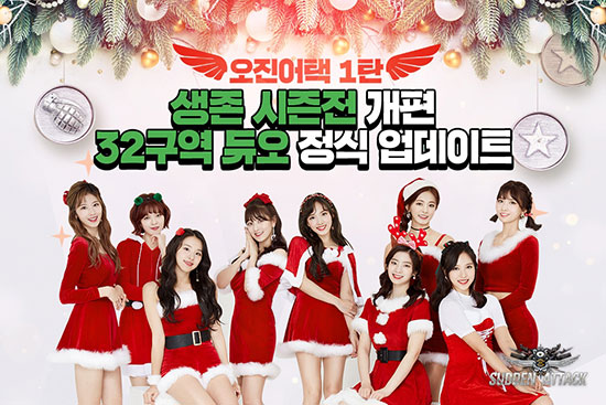 ³Ø½¼Àº 30ÀÏ ÀÚ»ç ¿Â¶óÀÎ FPS °ÔÀÓ ¡®¼µç¾îÅá¯ÀÇ °Ü¿ï ´ë±Ô¸ð Ä·ÆäÀÎ ¡®¿ÀÁø¾îÅá¯ÀÇ Ã¹ ¹øÂ° ÄÜÅÙÃ÷ ¡®»ýÁ¸ ½ÃÁðÀü¡¯ ¹× ¡®32±¸¿ª µà¿À¡¯¸¦ °ø°³Çϰí, ¡®»êŸ Æ®¿ÍÀ̽º¡¯ ½Å±Ô ij¸¯Å͸¦ Ãâ½ÃÇß´Ù. ¸ÕÀú, »ýÁ¸¸ðµå ½ÃÁðÀü °³ÆíÀ» ÅëÇØ »ýÁ¸¸ðµå(Ŭ·£/¿ëº´Àü Á¦¿Ü) Ç÷¹ÀÌ ½Ã ÀÚµ¿À¸·Î ½ÃÁ𠼺ÀûÀÌ ±â·ÏµÇ°í, ¿øÇÏ´Â ¸ÊÀ» ¼±ÅÃÇÒ ¼ö ÀÖ°Ô µÆ´Ù. ½ÃÁðÀº ¸Å¿ù 1ÀϺÎÅÍ ¸»ÀϱîÁö Á¤±âÀûÀ¸·Î ¿î¿µµÇ¸ç, ÃÑ 5°³ÀÇ µî±Þ(Ƽ¾î)ÀÌ Á¸ÀçÇØ ½ÃÁð Á¾·á ÈÄ µî±Þ¿¡ µû¸¥ º¸»óÀ» Â÷µî Áö±ÞÇÑ´Ù. ÀÌ¿Í ÇÔ²² Áö³ 9¿ù ½Ã¹ü ¿î¿µÇß´ø ¡®32±¸¿ª µà¿À¡¯ ¸ÊÀ» Á¤½Ä ¿ÀÇÂÇß´Ù. ¡®32±¸¿ª µà¿À¡¯´Â 2ÀÎ 1Á¶ »ýÁ¸¸ðµå ¸ÊÀ¸·Î, ¾Æ±ºÀÇ ¹«Àå»óÅÂ¿Í Ã¼·ÂÀ» ¹Ù·Î È®ÀÎÇÒ ¼ö ÀÖ°í, °÷°÷¿¡ ¼³Ä¡µÈ ¤¶óÀÎÀ» Ȱ¿ëÇØ ºü¸£°Ô Àå¼Ò À̵¿ÀÌ °¡´ÉÇÏ´Ù. ¶Ç, ¹«ÀÛÀ§·Î µîÀåÇÏ´Â ¡®°øÁߺ¸±Þ µå·Ð¡¯À» °ø°ÝÇϸç ÇÊ¿äÇÑ º¸±ÞǰÀ» ȹµæÇÒ ¼ö ÀÖ´Ù. ³Ø½¼Àº ¾÷µ¥ÀÌÆ®¸¦ ±â³äÇØ 12¿ù 21ÀϱîÁö °ø½Ä ȨÆäÀÌÁö °Ô½ÃÆÇ¿¡ ¡®32±¸¿ª µà¿À¸Ê °ø·«±Û¡¯À» °Ô½ÃÇÑ À¯Àú Áß Ãß÷À» ÅëÇØ ¡®10¸¸ ³Ø½¼Ä³½Ã¡¯¸¦ Áö±ÞÇÑ´Ù. ¶ÇÇÑ 12¿ù Å©¸®½º¸¶½º ½ÃÁðÀ» ¸Â¾Æ, ¡®Aº¸±Þâ°í¡¯, ¡®32±¸¿ª(´ë±â¼¶)¡¯ µî Å©¸®½º¸¶½º ¸Ê ½ºÅ²°ú °ÔÀÓ ¹è°æ À½¾Ç(BGM)À» ¾÷µ¥ÀÌÆ®ÇÏ´Â µî ÀÎ °ÔÀÓ¿¡¼ Å©¸®½º¸¶½º ºÐÀ§±â¸¦ ¿¬ÃâÇØ ½Ãû°¢Àû Áñ°Å¿òÀ» Á¦°øÇÑ´Ù. ÀÌ¿Í ÇÔ²², »êŸ ÄܼÁÆ®ÀÇ Æ®¿ÍÀ̽º ij¸¯ÅÍ 9Á¾µµ ¼±º¸¿´´Ù. ¡®³ª¿¬¡¯, ¡®»ç³ª¡¯, ¡®¹Ì³ª¡¯, ¡®´ÙÇö¡¯, ¡®Ã¤¿µ¡¯ ·¹µå ij¸¯ÅÍ¿Í ¡®Á¤¿¬¡¯, ¡®¸ð¸ð¡¯, ¡®ÁöÈ¿¡¯, ¡®ÂêÀ§¡¯ ºí·ç ij¸¯ÅÍ·Î ³ª´µ¸ç, ¡®»êŸ Æ®µÕÀÌ¡¯, ¡®ÈÀÌÆ® Å©¸®½º¸¶½º¡¯ µî Àü¿ë ij¸¯ÅÍ °¨Á¤Ç¥Çö°ú ½ÇÁ¦ À½¼ºÈ¿°ú°¡ Àû¿ëµÈ´Ù. 12¿ù 14ÀϱîÁö ¡®»êŸ Æ®¿ÍÀ̽º Ä«¿îÆ®¡¯¸¦ ±¸¸ÅÇÏ¿© ¡®»êŸ Æ®¿ÍÀ̽º ij¸¯ÅÍ ¼¼Æ®(7ÀÏ ¶Ç´Â 50ÀÏ)¡¯ ´ç÷ Áï½Ã ¡®Ä³¸¯ÅÍ ÇÁ¸® ƼÄÏ(3°³)¡¯À» ½Ç½Ã°£À¸·Î Áö±ÞÇϰí, »êŸ Æ®¿ÍÀ̽º ij¸¯ÅÍ ±â°£ 50ÀÏ ´Þ¼º ½Ã¿£ ¡®[TWICE]¡¯ À¯´ÏÅ© ¾Ö´Ï¸ÞÀÌ¼Ç ÄªÈ£¸¦ Ãß°¡ Áö±ÞÇÑ´Ù. ¶ÇÇÑ, 12¿ù 14ÀϱîÁö ¡®»êŸ Æ®¿ÍÀ̽º¡¯ ÆÛÁñÆÇÀ» ¿Ï¼ºÇÑ À¯Àú Àü¿ø¿¡°Ô ¡®AK103(IS) Therapy (30ÀÏ)¡¯, ¡® Tiger Stripe Therapy(30ÀÏ)¡¯À» Á¦°øÇϰí, Ãß÷À» ÅëÇØ 500¸í¿¡°Ô´Â Æ®¿ÍÀ̽º¿Í ÇÔ²²ÇÏ´Â ¿ÀÇÁ¶óÀÎ Çà»ç ÃÊ´ë±ÇÀ», 500¸í¿¡°Ô´Â Æ®¿ÍÀ̽º ´ëÇü ¸¶¿ì½º ÆÐµå¸¦ ¼±¹°ÇÑ´Ù. ¼µç¾îÅà ¡®¿ÀÁø¾îÅᯠ°Ü¿ï ´ë±Ô¸ð Ä·ÆäÀο¡ °üÇÑ ÀÚ¼¼ÇÑ ³»¿ëÀº ¼µç¾îÅà °ø½Ä ȨÆäÀÌÁö(http://sa.nexon.com)¸¦ ÅëÇØ È®ÀÎÇÒ ¼ö ÀÖ´Ù.