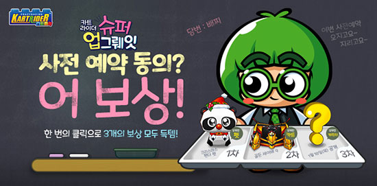 ³Ø½¼Àº ijÁÖ¾ó ·¹À̰̽ÔÀÓ ¡®Å©·¹ÀÌÁö·¹ÀÌ½Ì Ä«Æ®¶óÀÌ´õ(ÀÌÇÏ Ä«Æ®¶óÀÌ´õ)¡¯ÀÇ 2017 °Ü¿ï ¾÷µ¥ÀÌÆ® ¡®½´ÆÛ¾÷±×·ñÀÕ¡¯À» ¾ÕµÎ°í »çÀü¿¹¾à Âü°¡ÀÚ¸¦ 14ÀϺÎÅÍ ¸ðÁýÇÑ´Ù. ¡®½´ÆÛ¾÷±×·ñÀÕ¡¯Àº ¿À´Â 12¿ù 21ÀϺÎÅÍ 1¿ù 25ÀϱîÁö ÃÑ 3ȸ¿¡ °ÉÃÄ ÁøÇàµÇ¸ç, ¸Åȸ ÄÜÅÙÃ÷ ¾÷µ¥ÀÌÆ®¿Í ÇÔ²² ½Å±Ô È«º¸ ¿µ»óÀ» °ø°³Çϰí dz¼ºÇÑ ¾ÆÀÌÅÛ º¸»óÀ» Á¦°øÇÑ´Ù. À̹ø ¾÷µ¥ÀÌÆ® »çÀü¿¹¾àÀº 14ÀϺÎÅÍ °ø½Ä ȨÆäÀÌÁö(http://kart.nexon.com/)¿¡¼ ÁøÇàÇϸç, »çÀü¿¹¾à¿¡ Âü°¡ÇÏ°í °¢ ¾÷µ¥ÀÌÆ® ½Ã±â¿¡ ¸ÂÃç °ÔÀÓ¿¡ Á¢¼ÓÇÏ¸é ¡®Å©¸®½º¸¶½º ÆÒ´õ Æê(¹«Á¦ÇÑ)¡¯, ¡®°ñµç ¼¼À̹ö9(¹«Á¦ÇÑ)¡¯, ¡®½Å±Ô ¹«Á¦ÇÑ Ä³¸¯ÅÍ¡¯¸¦ Áö±ÞÇÑ´Ù. ÇÑÆí, 12¿ù 20ÀϱîÁö PC¹æ¿¡¼ °ÔÀÓ¿¡ Á¢¼ÓÇÑ À¯Àúµé¿¡°Ô´Â ¸ÅÀÏ ¡®¸¶¼ú ÁöÆÎÀÌ 5°³¡¯¸¦ Á¦°øÇϰí, ´©Àû Ç÷¹ÀÌŸÀÓ¿¡ µû¶ó ¡®¸¶¼ú ÁöÆÎÀÌ¡¯, ¡®½´ÆÛÀ§Å© º¸¼®¡¯, ¡®°ñµç ¼Ö¶ó 9(¹«Á¦ÇÑ)¡¯ µî PC¹æ ÇÁ¸®¹Ì¾ö ÇýÅÃÀ» ºÎ¿©ÇÑ´Ù. ¡®Ä«Æ®¶óÀÌ´õ¡¯ÀÇ °Ü¿ï ¾÷µ¥ÀÌÆ® ¡®½´ÆÛ¾÷±×·ñÀÕ¡¯¿¡ ´ëÇÑ º¸´Ù ÀÚ¼¼ÇÑ ³»¿ëÀº ȨÆäÀÌÁö¸¦ ÅëÇØ È®ÀÎÇÒ ¼ö ÀÖ´Ù.