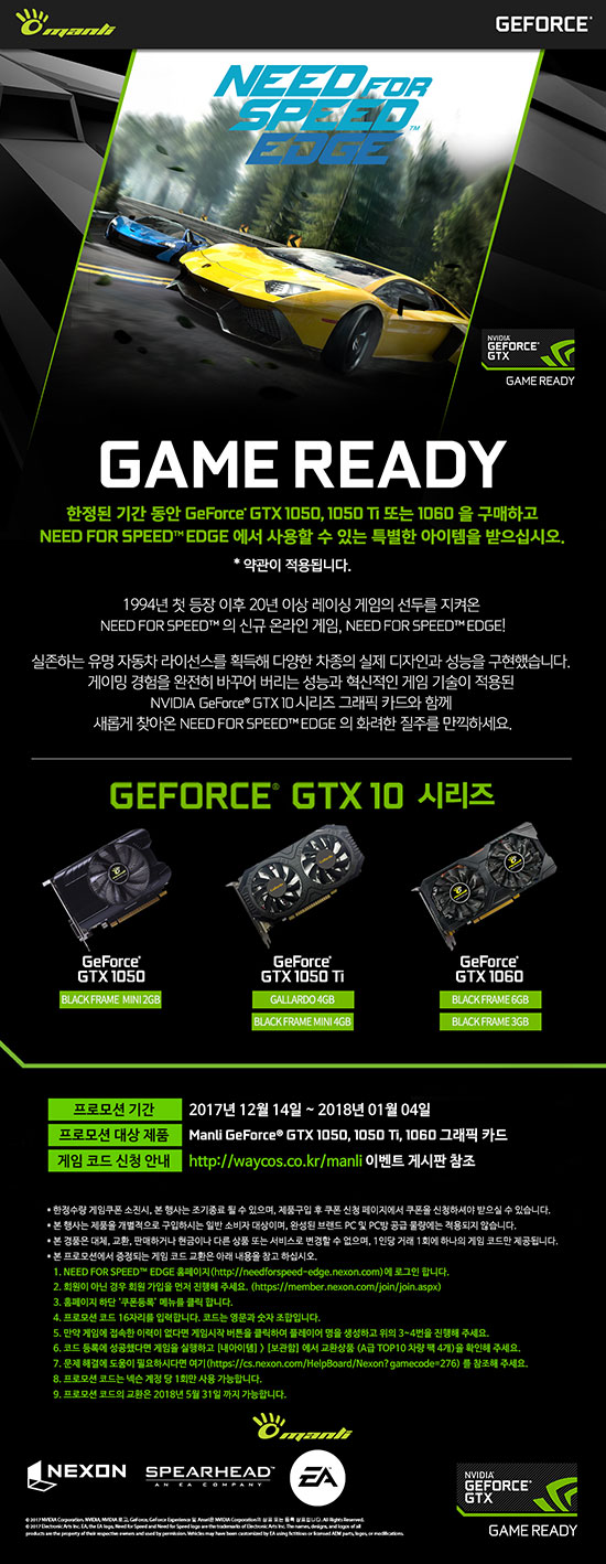 º» ÇÁ·Î¸ð¼ÇÀº 2017³â 12¿ù 14ÀϺÎÅÍ 2018³â 1¿ù 4ÀϱîÁö ÇÑÁ¤¼ö·®À¸·Î ÁøÇàµÇ¸ç, ¸¸¸® ±×·¡ÇÈÄ«µå ÁöÆ÷½º GTX 1060, 1050 Ti, 1050 Á¦Ç° ±¸¸Å ÈÄ À̺¥Æ® ÀÀ¸ð ÆäÀÌÁö¸¦ ÅëÇØ Á¦Ç°ÀÇ ±¸¸ÅÀÏÀÚ, Á¦Ç°¸í, Á¦Ç°¹øÈ£ µîÀ» Á¦ÃâÇϰí À̸ÞÀÏÀ» ÅëÇØ ÄíÆù Äڵ带 ¼ö·ÉÇÑ µÚ, ¡®NEED FOR SPEED¢â EDGE¡¯ ȨÆäÀÌÁö¸¦ ÅëÇØ µî·ÏÇÏ¿© °ÔÀÓ Ç÷¹À̽à »ç¿ëÇÒ ¼ö ÀÖ´Â A±Þ TOP10 Â÷·® 4´ë¸¦ ±³È¯ ¹ÞÀ» ¼ö ÀÖ´Ù.