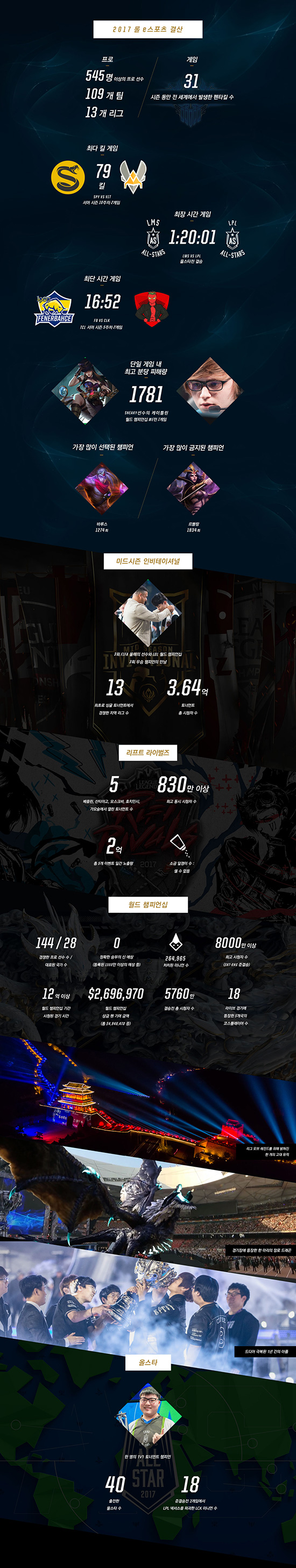 4¿ù 28ÀϺÎÅÍ 5¿ù 21ÀϱîÁö ÁøÇàµÈ ¡®2017 ¹Ìµå ½ÃÁð ÀκñÅ×À̼ųΡ¯Àº 3¾ï 6,400¸¸ ¸íÀÇ ÃÑ ½ÃûÀÚ ¼ö¸¦ ±â·ÏÇß´Ù. ¶ÇÇÑ ¿ÃÇØ óÀ½À¸·Î ½Å¼³µÇ¾î 7¿ù ÃÊ Àü¼¼°è 5°³ ±Ç¿ª¿¡¼ ÁøÇàµÈ ±¹Á¦ ´ëȸ ¡®2017 ¸®ÇÁÆ® ¶óÀ̹úÁ´Â ÃÖ°í µ¿½Ã ½ÃûÀÚ ¼ö 830¸¸ ¸íÀ» ±â·ÏÇßÀ¸¸ç, Àü ±Ç¿ª ´ëȸ¿¡¼ Àϰ£ 2¾ï¿¡ ´ÞÇÏ´Â ³ëÃâ·®À» ±â·ÏÇϱ⵵ Çß´Ù. ¿¬¸»À» Àå½ÄÇϸç 12¿ù 7ÀϺÎÅÍ 10ÀϱîÁö ¿¸° ¡®2017 LoL ¿Ã½ºÅ¸Àü¡¯¿¡¼´Â ´ë¸¸/È«Äá/¸¶Ä«¿À ÆÀ°ú Áß±¹ ÆÀ °£¿¡ 1½Ã°£ 20ºÐ 1ÃÊ¿¡ ´ÞÇÏ´Â ¿ÃÇØÀÇ ÃÖÀå±âÀüÀÌ ÆîÃÄÁö´Â µî, ÇÑ ÇØ µ¿¾È ¼ö¸¹Àº e½ºÆ÷Ã÷ ´ëȸµé°ú ´ë°áÀÌ ÆîÃÄÁ® Àü¼¼°è e½ºÆ÷Ã÷ ÆÒµéÀ» Áñ°Ì°Ô Çß´Ù.