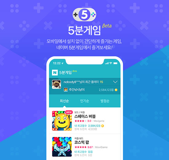 ³×À̹ö ¡®5ºÐ°ÔÀÓ¡¯Àº ¸ð¹ÙÀÏ ¡®»ÕÆÇ¡¯(https://5mg.naver.com/)¿¡¼ ¸¸³ªº¼ ¼ö ÀÖÀ¸¸ç, ¸ðºñ°ÔÀÓ¿¡¼ °³¹ßÇÑ °ÔÀÓ °¡¿îµ¥ ¡®Æë±Ï´ë½¬¡¯, ¡®Á»ºñ °Ç¡¯, ¡®¶óÀ̹ú ·¹À̡̽¯, ¡®»óÇÏÀÌ Å¸¿î¡¯, ³×ÄÚÆÎ µî 13Á¾ÀÌ ¼ºñ½ºµÇ°í ÀÖ´Ù.