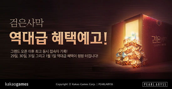 ÆÞ¾îºñ½º°¡ °³¹ßÇϰí īī¿À°ÔÀÓÁî¿¡¼ ¼ºñ½º ÁßÀÎ MMORPG '°ËÀº»ç¸·'ÀÌ Áö³ Å©¸®½º¸¶½º ¿¬ÈޱⰣ Áß ÃÖ°í µ¿½Ã Á¢¼ÓÀÚ ¼ö(ÀÌÇÏ µ¿Á¢ÀÚ ¼ö)¸¦ ±â·ÏÇÏ¿© ÃÖ°í µ¿Á¢ÀÚ ¼ö ±â³ä ÀÌ¿ëÀÚ °¨»çÁ¦¸¦ ÁøÇàÇÑ´Ù.