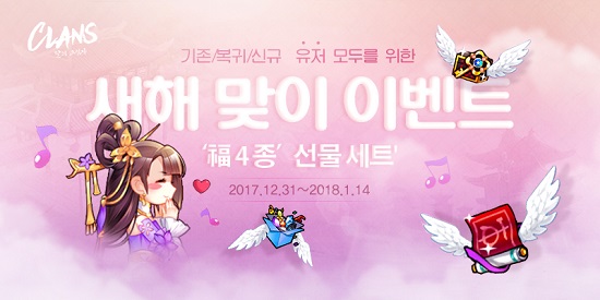 ¡®Å¬·£Á´Â 2018³â ¹«¼ú³â »õÇØ¸¦ ¸Â¾Æ ÀÌ¿ëÀÚµéÀ» À§ÇÑ Æ¯º° ÇÁ·Î¸ð¼ÇÀ» ÁøÇàÇÑ´Ù. ¿ì¼±, ·¹º§ 40 ÀÌ»óÀÇ ÀÌ¿ëÀÚµéÀº ¿À´Â 14ÀϱîÁö °ÔÀÓ¿¡ Á¢¼Ó¸¸ ÇØµµ ǪÁüÇÑ ·Î±×ÀÎ º¸»óÀ» ¹Þ¾Æº¼ ¼ö ÀÖ´Ù. ¶ÇÇÑ, ¿ìÆíÀ» ÅëÇØ ȹµæÇÑ Ãູ Ä«µå·Î ´Ù¸¥ ÀÌ¿ëÀÚ¿¡°Ô ÃູÀ» ÁÖ°í, ÃູÀ» ¸¹ÀÌ ¹ÞÀ»¼ö·Ï º¸»óµµ ´õ¿í dz¼ºÇØÁö´Â À̺¥Æ®¸¦ ¿À´Â 8ÀϱîÁö ½Ç½ÃÇÒ °èȹÀÌ´Ù.