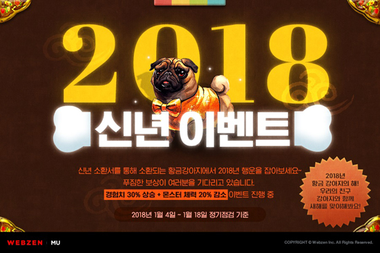À¥Á¨ ¡®¹Â ¿Â¶óÀΡ¯ÀÇ 2018³â ½Å³â À̺¥Æ® ¹× °ÔÀÓ¿¡ ´ëÇÑ º¸´Ù ÀÚ¼¼ÇÑ Á¤º¸´Â À̺¥Æ®ÆäÀÌÁö(http://www.muonline.co.kr/news/events/detail/41165)¿¡¼ È®ÀÎÇÒ ¼ö ÀÖ´Ù.