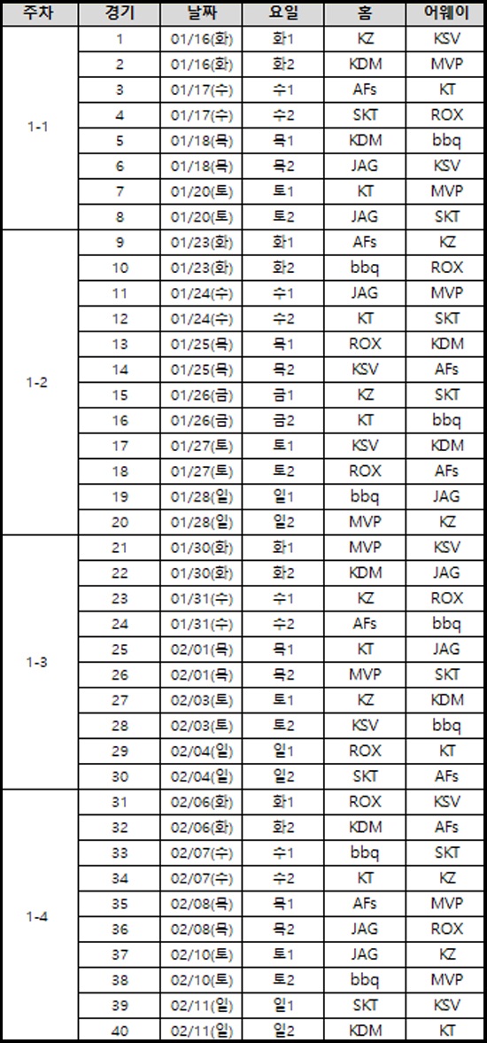 2018 LCK ½ºÇÁ¸µ Á¤±Ô ½ÃÁð ´ëÁø ¹× Àüü ÀÏÁ¤µµ ÇÔ²² °ø°³µÆ´Ù. ´ëÁø ÀÏÁ¤Àº 10°³ ÆÀµéÀÇ °æ±â °£°Ý ¹× ÆòÀϰú ÁÖ¸» °æ±â Ƚ¼ö µî ¸ðµç Á¶°ÇÀ» ÃÖ´ëÇÑ °í·ÁÇÏ¿© ¹«ÀÛÀ§ Ãß÷À¸·Î °áÁ¤µÆ´Ù.