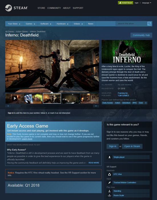 º» °ÔÀÓÀÇ ½ºÅ©¸°¼¦ ¹× µ¿¿µ»ó µî, »ó¼¼ Á¤º¸´Â ½ºÆÀ ¡®Ãâ½Ã ¿¹Á¤(Upcoming)¡¯ÆäÀÌÁö(http://store.steampowered.com/app/683150/Inferno_Deathfield/)¿¡¼ È®ÀÎÇÒ ¼ö ÀÖÀ¸¸ç VR½Ã½ºÅÛ ¡®VIVE(¹ÙÀ̺ê)¡¯¹öÀüÀ¸·Î ±Û·Î¹ú Ãâ½ÃµÉ ¿¹Á¤ÀÌ´Ù.