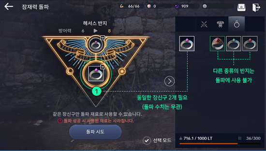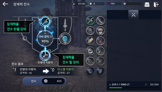 ÀáÀç·ÂÀ» Àü¼öÇÒ Àåºñ¸¦ ¼±ÅÃÇϰí [Àü¼ö] ¹öưÀ» Ŭ¸¯Çϸé ÀÏÁ¤·®ÀÇ µ¹ÆÄ ¼öÄ¡°¡ ¿Å°ÜÁ® ÀáÀç·Â Àü¼ö°¡ °¡´ÉÇÏ´Ù. À¯ÀúµéÀº »õ·Î¿î Àåºñ¸¦ ȹµæÇÏ¿© óÀ½ºÎÅÍ ÀáÀç·ÂÀ» µ¹ÆÄÇÒ ºÎ´ãÀ» °®Áö ¾Ê¾Æµµ µÈ´Ù. ÀÌ ¿Ü¿¡µµ ±¤¿ø¼®, ¼öÁ¤À» Àåºñ¿¡ ÀåÂøÇØ Ãß°¡ ¿É¼ÇÀ» ¾òÀ» ¼ö ÀÖ´Ù.