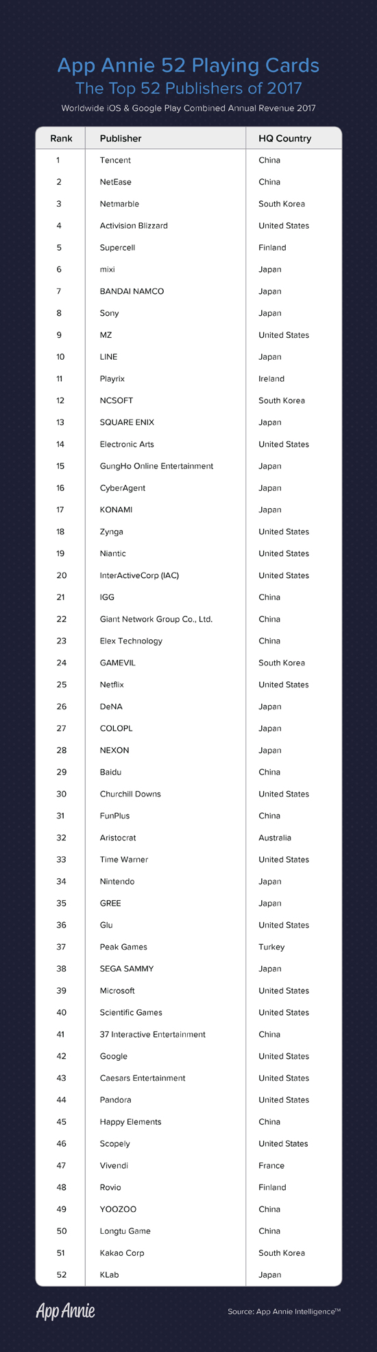 2017³â Àü¼¼°è iOS ¹× Google Play ÇÕ»ê ¼öÀÍ ±âÁØ Àü¼¼°è »óÀ§ 52´ë ÆÛºí¸®¼Å ¸®½ºÆ®¿¡ Æ÷ÇÔµÈ ±¹³» ÆÛºí¸®¼Å¿¡´Â ³Ý¸¶ºí(3À§), ¿£¾¾¼ÒÇÁÆ®(12À§), °ÔÀÓºô(24À§) µî ±¹³» °ÔÀÓ°³¹ß»ç¿Í īī¿À(51À§)°¡ À̸§À» ¿Ã·È´Ù.