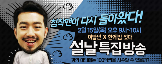 2¿ù 15ÀÏ(¸ñ) ¿ÀÈÄ 9½ÃºÎÅÍ ÇÑ ½Ã°£ µ¿¾È ÁøÇàµÉ ¡®À̸»³â 2018 ¼³³¯ 'ÇѰÔÀÓ ¼¸´ÙM'¡¯ ¹æ¼ÛÀº ÀÛ³â À̸»³â ÀÛ°¡°¡ ¾Æ½±°Ô ½ÇÆÐÇß´ø ¡®100¾ï ¾ ÁöŰ±â¡¯ ¹Ì¼ÇÀ» ÀçµµÀüÇÏ´Â ÄܼÁÆ®´Ù. À̸»³â ÀÛ°¡´Â Áö³ ÇØ 12¿ù 'ÇѰÔÀÓ ¼¸´ÙM' °ÔÀÓ ¹æ¼Û¿¡¼ °í¼öÀÇ ºÐÀ§±â¸¦ dz±â¸ç ÃÊ¹Ý ÁÁÀº ¼ºÀûÀ» À̾´Ù, ¸¶Áö¸· 4ȸÂ÷ ¹æ¼Û¿¡¼ ÁøÇàÇß´ø ¡®100¾ï ¾ ÁöŰ±â¡¯ ¹Ì¼Ç¿¡¼ ÆÐ¹èÇÏ¸ç ¾Æ½¬¿î ¸¶À½À¸·Î ¹æ¼ÛÀ» Á¾·áÇÑ ¹Ù ÀÖ´Ù.