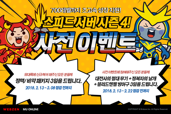 À¥Á¨ÀÇ ´ëÇ¥ PC MMORPG ¡®¹Â ¿Â¶óÀΡ¯ÀÇ ¡®½ºÇÇµå ¼¹ö ½ÃÁð 4¡¯ ³»¿ë°ú ±â³ä À̺¥Æ®, °ÔÀÓ¿¡ ´ëÇÑ º¸´Ù ÀÚ¼¼ÇÑ Á¤º¸´Â »çÀü¿¹¾à ÆäÀÌÁö(http://event.muonline.co.kr/SpeedSeason4)¿¡¼ È®ÀÎÇÒ ¼ö ÀÖ´Ù.
