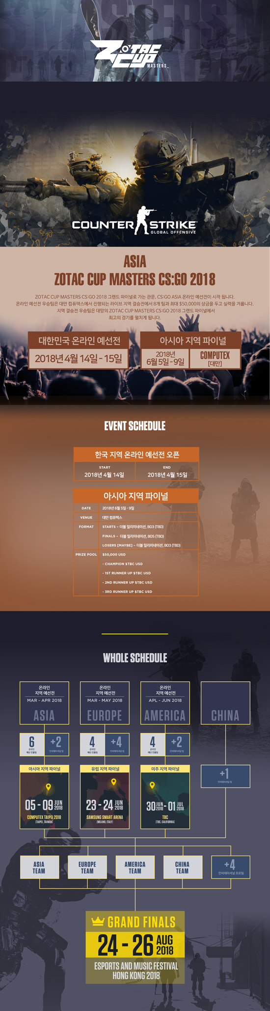 2018³â 3¿ùºÎÅÍ 6¿ù±îÁö´Â ZOTAC CUP ¿Â¶óÀÎ Åä³Ê¸ÕÆ® Ç÷§ÆûÀ» ÅëÇØ ¾Æ½Ã¾Æ Áö¿ª°ú À¯·´, ¹Ì±¹ µî¿¡¼ ¿Â¶óÀÎ ¿¹¼±ÀüÀÌ ÁøÇàµÈ´Ù. ¼±¹ßµÈ ÆÀÀº °¢°¢ Áö¿ªº° °á½ÂÀü¿¡ ÁøÃâÇÏ°Ô µÇ¸ç, °¢°¢ ´ë¸¸ Computex¿Í ÀÌÅ»¸®¾Æ ¹Ð¶ó³ë Samsung Smart Arena, ¹Ì±¹ ͏®Æ÷´Ï¾Æ¿¡¼ $20,000ÀÇ »ó±ÝÀ» °É°í ´ë°áÀ» ÆîÄ¡°Ô µÈ´Ù. 2018³â 8¿ù È«Äá¿¡¼ ÁøÇàµÇ´Â ´ë¸ÁÀÇ ±×·£µå ÆÄÀ̳ο¡¼´Â Áß±¹ÆÀ°ú 4°³ÀÇ ÃÊ´ëÆÀÀ» Æ÷ÇÔÇÑ ÃÑ 8°³ ÆÀÀÌ ÃÖ°í¸¦ À§ÇÑ °á½ÂÀüÀ» ÁøÇàÇÑ´Ù.