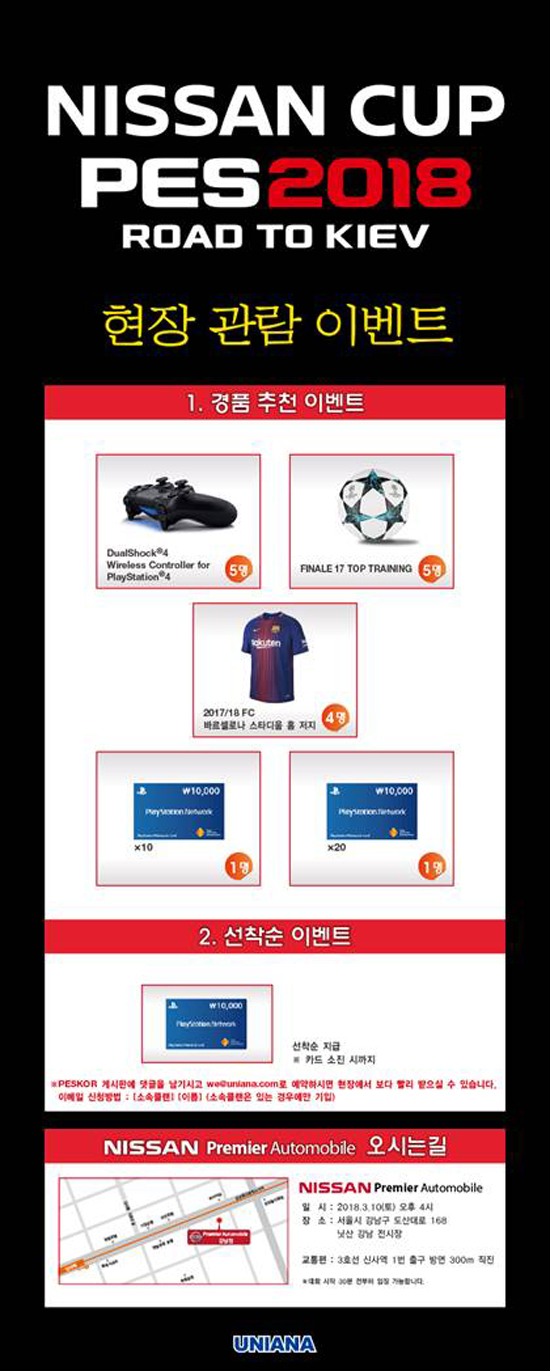 ¡®NISSAN CUP º»¼±¡¯ÀÇ ´ëȸ ±ÔÁ¤ µî º¸´Ù »ó¼¼ÇÑ ³»¿ëÀº ¡®À¯´Ï¾Æ³ª ³×À̹ö Ä«ÆäPESKOR(http://cafe.naver.com/peskor)¡¯, PES2018 °ø½Ä ÆäÀ̽ººÏ(https://www.facebook.com/pes.korea/) ¹× ¡®´Ö»ê ÄÚ¸®¾Æ ÆäÀ̽ººÏ(https://www.facebook.com/nissan.korea/)¡¯ µî ¿¡¼ È®ÀÎÇÒ ¼ö ÀÖ´Ù.