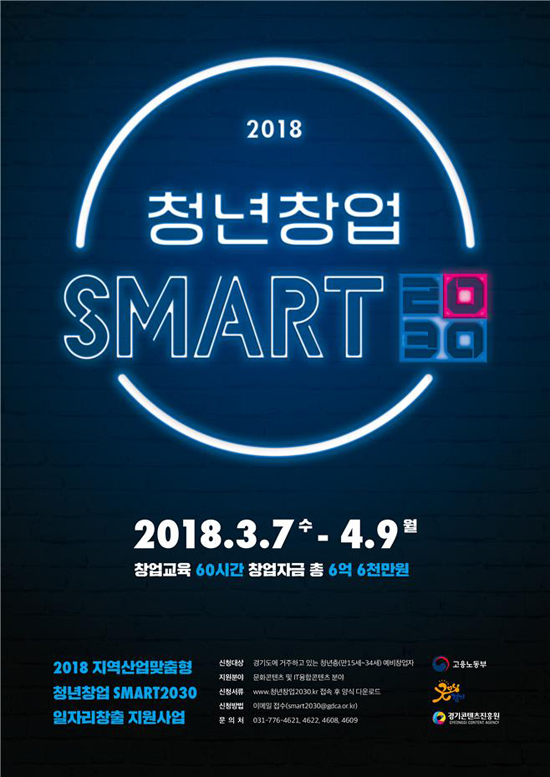 °æ±âµµ´Â °í¿ë³ëµ¿ºÎ Áö¿ª¡¤»ê¾÷¸ÂÃãÇü ÀÏÀÚ¸®Ã¢Ãâ Áö¿ø»ç¾÷ ¡®Ã»³ââ¾÷ SMART2030¡¯ ÇÁ·Î±×·¥ Áö¿ø±â¾÷À» 4¿ù 9ÀϱîÁö ¸ðÁýÇÑ´Ù. û³ââ¾÷ SMART2030Àº ¿¹ºñâ¾÷ÀÚÀÇ ¿ª·®°È¿Í ¼º°øÀûÀΠâ¾÷À» À§ÇØ 60½Ã°£ÀÇ ±³À°°ú ÃÑ 6¾ï 6õ¸¸ ¿øÀÇ ÀÚ±ÝÀ» Áö¿øÇÑ´Ù. ½Å¿ëº¸ÁõÀ» ÅëÇØ 30°³ ±â¾÷ ´ë»ó 25¾ï 5õ 5¹é¸¸ ¿øÀÇ À¶ÀÚ¸¦ È®Á¤ÇÏ´Â µî »çÈÄÁö¿øÀ» ÅëÇØ ¾ÈÁ¤ÀûÀΠâ¾÷À» Áö¼ÓÇÒ ¼ö Àִ ȯ°æÀ» Á¦°øÇÒ ¿¹Á¤ÀÌ´Ù.