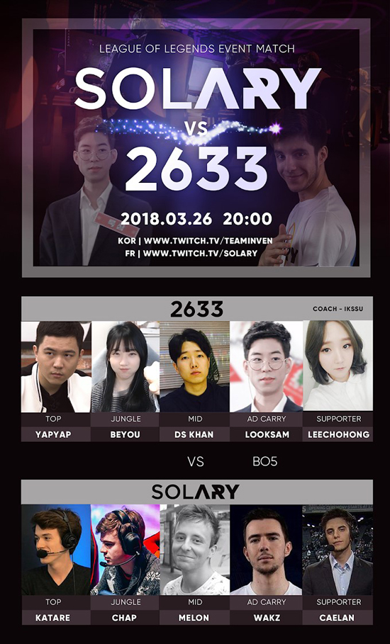 Æ®À§Ä¡´Â ¿À´Â 26ÀÏ ¿ÀÈÄ 8½Ã, ÇÁ¶û½º LoL ½ºÆ®¸®¸Ó ÆÀ ¡®Solary¡¯¿Í Çѱ¹ ½ºÆ®¸®¸Óµé·Î ±¸¼ºµÈ ¡®2633¡¯ÀÇ ¸Â´ë°áÀ» »ýÁß°èÇÑ´Ù°í 23ÀÏ ¹àÇû´Ù.