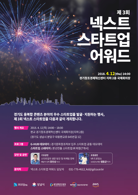 À̳¯ Çà»ç´Â Å©°Ô ¡®½ºÅ¸Æ®¾÷ ½ºÅ×ÀÌÁö¡¯ ¿Í ¡®G-HUB µ¥¸ðµ¥ÀÌ¡¯ µÎ ºÎ¹®À¸·Î ³ª´©¾î ÁøÇàµÈ´Ù. ¡®½ºÅ¸Æ®¾÷ ½ºÅ×ÀÌÁö¡¯´Â ¡®°æ±âµµ ³» À¶¡¤º¹ÇÕ ÄÜÅÙÃ÷ ºÐ¾ßÀÇ ½ºÅ¸Æ®¾÷(7³â ¹Ì¸¸)À», ¡®G-HUB µ¥¸ðµ¥ÀÌ¡¯´Â °æ±âÄÜÅÙÃ÷ÁøÈï¿øÀÌ °³¼ÒÇÑ ½ºÅ¸Æ®¾÷ Áö¿ø¼¾ÅÍÀÎ °æ±â¹®ÈâÁ¶Çãºê¿¡ ÀÔÁÖÇÑ ½ºÅ¸Æ®¾÷À» ´ë»óÀ¸·Î ÇÏ´Â °ø°³ °æÀï½É»ç´Ù.
