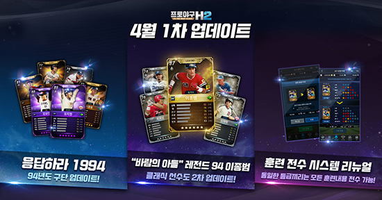 ÇÁ·Î¾ß±¸ H2´Â ÀÌÁ¾¹üÀ» ·¹Àüµå ¼±¼ö Ä«µå·Î Ãß°¡Çß´Ù. ÀÌ¿ëÀÚ´Â ÁöÁ¤µÈ 40¸íÀÇ ¼±¼ö Ä«µå¸¦ µî·ÏÇØ ·¹Àüµå ÀÌÁ¾¹üÀ» ¿µÀÔÇÒ ¼ö ÀÖ´Ù. ÀÌÁ¾¹üÀº ºü¸¥ ¹ßÀ» Áö³à ¡®¹Ù¶÷ÀÇ ¾Æµé¡¯À̶ó´Â º°¸íÀ¸·Î ºÒ·È´Ù. ÀÌÁ¾¹üÀÌ È°¾àÇÏ´Â ¸ð½ÀÀº(¡®94³â 84µµ·ç) ÇÁ·Î¾ß±¸ H2 Ưº° ¿µ»ó¿¡µµ ´ã°ÜÀÖ´Ù. ¡®94³âµµ ½ÃÁð¿¡ Çѱ¹ ÇÁ·Î¾ß±¸¿¡¼­ Ȱ¾àÇÑ ¼±¼ö 366¸íÀ» ¾÷µ¥ÀÌÆ®Çß´Ù. ÀÌ¿ëÀÚ´Â ¼±¼öÆÑ°ú ¼±¼ö Á¶ÇÕÀ» ÅëÇØ ½Å±Ô ¼±¼ö Ä«µå¸¦ ¾òÀ» ¼ö ÀÖ´Ù. ÇÔ²² °ø°³ÇÑ ¹èÁö 4Á¾°ú ºê·ÎÄ¡ 6Á¾À» Á¦ÀÛÇÏ¸é ¼±¼ö Ä«µå¿¡ ¹öÇÁ(buff, °­È­) È¿°ú¸¦ ÁÙ ¼ö ÀÖ´Ù.