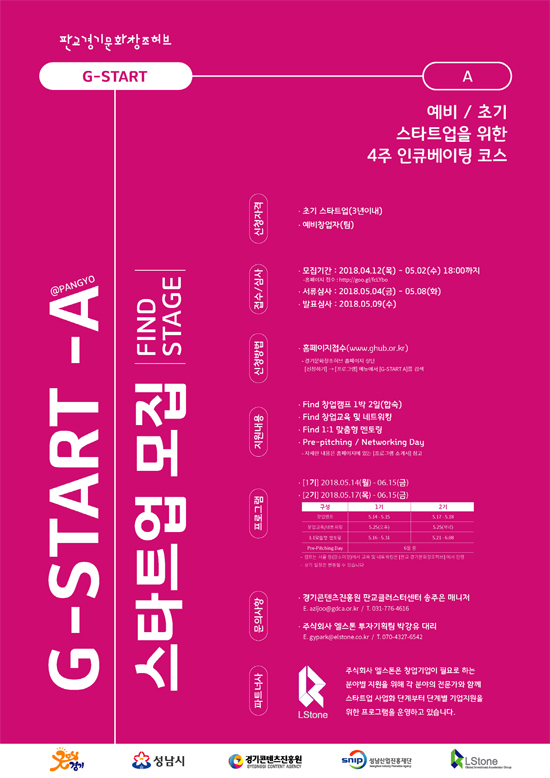ÆÇ±³ °æ±â¹®ÈâÁ¶Çãºê¿¡¼ ÁøÇàµÇ´Â G-START A´Â Ãʱâ´Ü°è ºñÁî´Ï½º ½ÇÇàÀ» À§ÇÑ Çٽɿä¼ÒÀÎ »ç¾÷¾ÆÀÌÅÛ °³¹ßÀ» ÁýÁß°ü¸®ÇÏ´Â ÀÎÅ¥º£ÀÌÆÃ ÇÁ·Î±×·¥ÀÌ´Ù. ÇÕ¼÷Çü â¾÷Ä·ÇÁ¸¦ ºñ·ÔÇÏ¿© ¡ã±³À° ¡ã¸àÅ丵 ¡ã³×Æ®¿öÅ· ÇÁ·Î±×·¥À¸·Î ±¸¼ºµÇ¾î ÀÖ´Ù. ¿ÃÇØ´Â 2±â¼ö¸¦ ¿î¿µ ±â¼öº° 15¸í(ÆÀ)À» ¼±¹ßÇÒ ¿¹Á¤ÀÌ´Ù.