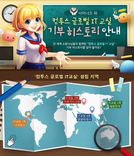 ¡®ÄÄÅõ½º ±Û·Î¹ú IT ±³½Ç¡¯Àº Àü¼¼°è ¾Æµ¿ ¹× û¼Ò³âµéÀÌ ¹Ì·¡ÀÇ ²Þ°ú Èñ¸ÁÀ» ÆîÄ¥ ¼ö ÀÖµµ·Ï ÄÄÅõ½º°¡ Áö¿øÇÏ´Â IT±³À° ȯ°æ °³¼± »ç¾÷ÀÌ´Ù. Áö³ 2016³â 6¿ù ¡®¼¸Ó³ÊÁî ¿ö¡¯ ±Û·Î¹ú ¼ºñ½º 2ÁÖ³âÀ» ±â³äÇØ Áß¾Ó¾Æ½Ã¾Æ Å°¸£±â½º½ºÅº¿¡ 1È£¸¦ Á¶¼ºÇßÀ¸¸ç, ÀÌÈÄ ¸Å³â µÎ Â÷·Ê¿¡ °ÉÃÄ ±¹³»¿Ü Áö¿ª ÇлýµéÀÇ ²Þ°ú Èñ¸ÁÀ» Áö¿øÇØ¿À°í ÀÖ´Ù. ƯÈ÷ ¡®±Û·Î¹ú IT±³½Ç¡¯Àº ¡®¼¸Ó³ÊÁî ¿ö¡¯ Àü¼¼°è À¯Àúµé°ú ÇÔ²²ÇÏ´Â ¹Ì¼Ç À̺¥Æ®¸¦ ÅëÇØ Àü°³µÇ°í ÀÖ¾î, ´õ¿í ¶æ ±íÀº °ø°£À¸·Î ¸¸µé¾îÁö°í ÀÖ´Ù. À¯ÀúµéÀÌ ÁÖ¾îÁø ¹Ì¼ÇÀ» ¸ðµÎ ¿Ï·áÇϸé Àڻ簡 ¸¶·ÃÇÑ ÈÄ¿ø±ÝÀ¸·Î IT ±³½ÇÀ» Á¶¼ºÇϰí ÀÖÀ¸¸ç, Áö±Ý±îÁö ÃÑ 4°³ Áö¿ªÀÇ Ã»¼Ò³â°ú ¾Æµ¿µé¿¡°Ô ¹è¿òÀÇ ±âȸ¿Í ¹àÀº ¹Ì·¡¸¦ ¼±¹°ÇØ¿À°í ÀÖ´Ù.