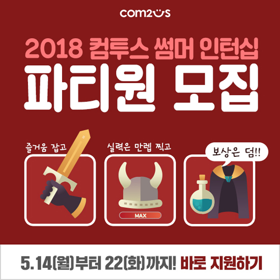 ÄÄÅõ½º´Â ±Û·Î¹ú ¸ð¹ÙÀÏ °ÔÀÓ ½ÃÀåÀ» À̲ø¾î °¥ ÀÎÀç À°¼ºÀ» À§ÇØ ¡®2018 ÄÄÅõ½º ½æ¸Ó ÀÎÅϽʡ¯À» ½Ç½ÃÇÑ´Ù°í 14ÀÏ ¹àÇû´Ù. ÄÄÅõ½º´Â À̹ø ÀÎÅϽÊÀ» ÅëÇØ °ÔÀÓ¿¡ ´ëÇÑ ¹«ÇÑÇÑ ¿Á¤°ú ¼ºÀå °¡´É¼ºÀ» °¡Áø ¿ì¼öÇÑ ÀÎÀ縦 ¸ðÁýÇϰí, ±Û·Î¹ú ½ÃÀåÀ» ¹«´ë·Î °ÔÀÓ °³¹ß∙»ç¾÷ µî°ú °ü·ÃµÈ Àü¹® ¾÷¹«¸¦ °æÇèÇÒ ¼ö ÀÖ´Â ±âȸ¸¦ Á¦°øÇÑ´Ù.