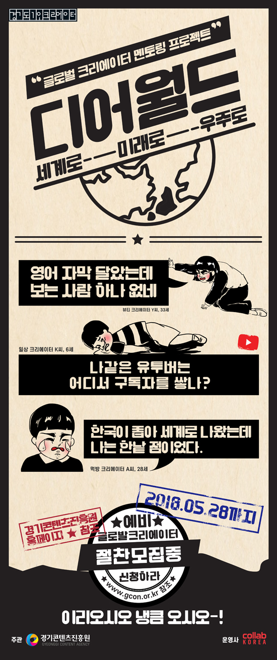 µð¾î¿ùµå ÇÁ·ÎÁ§Æ®´Â ¡®°æ±âµµ 1ÀÎ Å©¸®¿¡ÀÌÅÍ Áö¿ø »ç¾÷¡¯ÀÇ ÀÏȯÀ¸·Î °³±×¸Ç À¯¼¼À±°ú ºäƼ À¯Åõ¹ö À¯Æ®·ç µî À¯¸í Å©¸®¿¡ÀÌÅ͸¦ º¸À¯ÇÑ ¼¼°è ÃÖ´ë ±Ô¸ð µ¶¸³ MCN(Multi Channel Network. 1ÀÎâÀÛÀÚ¸¦ À§ÇÑ ±âȹ»ç)±â¾÷ ¡®ÄÝ·¦ÄÚ¸®¾Æ(Collab Korea)¡¯°¡ ¸Ã¾Æ ¿î¿µÇÑ´Ù. µð¾î¿ùµå ÇÁ·ÎÁ§Æ®(Dear World Project)´Â ¡®¼Ò¼ö Á¤¿¹ Å©¸®¿¡ÀÌÅÍ ÁýÁß ±Û·Î¹ú ¸àÅ丵¡¯ ÇÁ·Î±×·¥À¸·Î, ±Û·Î¹ú Å©¸®¿¡ÀÌÅÍ ¾ç¼ºÀ» ¸ñÇ¥·Î 20ÀÎ ³»¿ÜÀÇ Å©¸®¿¡ÀÌÅÍ ¶Ç´Â ÆÀ ´ë»óÀ¸·Î ÁøÇàµÈ´Ù.
