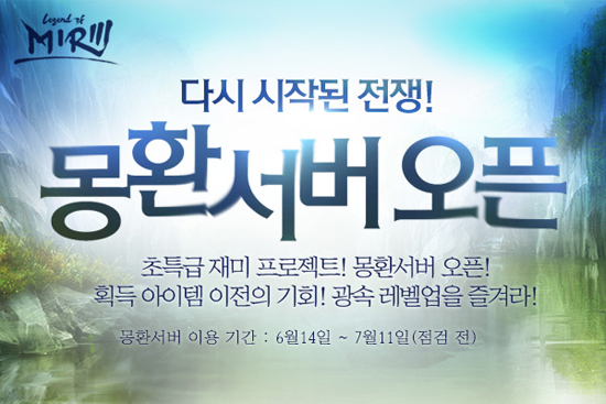 ¿ÍÀ̵ð¿Â¶óÀÎÀº Àü±â¾ÆÀÌÇÇ¿¡¼ °³¹ßÇϰí, Àڻ翡¼ ¼ºñ½ºÇÏ´Â MMORPG ¡®¹Ì¸£ÀÇ Àü¼³3¡¯°¡ ºü¸£°Ô ij¸¯Å͸¦ À°¼ºÇÒ ¼ö ÀÖ´Â ¡®¸ùȯ ¼¹ö¡¯¸¦ ¿ÀÇÂÇß´Ù°í ±ÝÀÏ(14ÀÏ) ¹àÇû´Ù. '¹Ì¸£ÀÇ Àü¼³3'´Â '¹Ì¸£ÀÇ Àü¼³2'¿Í ÇÔ²² ²ÙÁØÇÑ Àα⸦ ¹Þ¾Æ¿Â 1¼¼´ë ¹«Çù ¿Â¶óÀÎ MMORPG·Î, Áö³ 2003³â ±¹³» ¹× Áß±¹¿¡¼ Á¤½Ä ¼ºñ½º¸¦ ½ÃÀÛÇÑ ÀÌÈÄ °ÔÀÓ ÇÑ·ù¸¦ À̲ö ÁÖ¿ªÀ¸·Î Æò°¡¹ÞÀº ¹Ù ÀÖ´Ù.