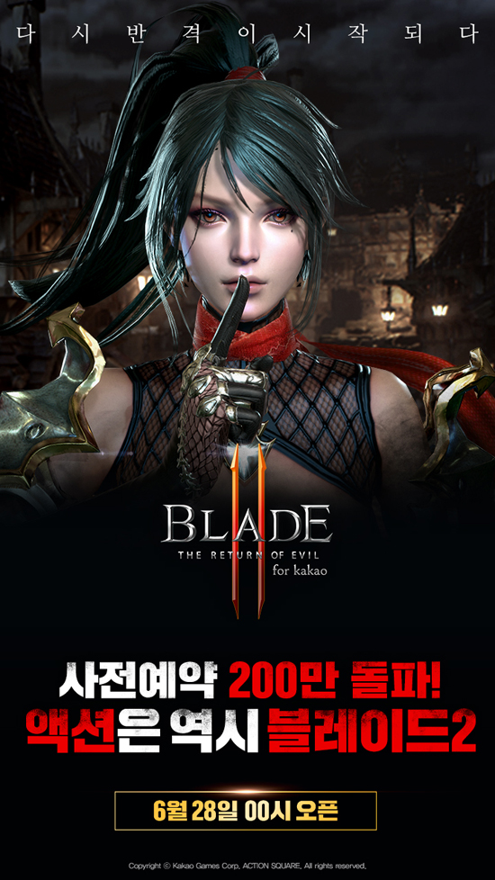 īī¿À°ÔÀÓÁî´Â 26ÀÏ(È) ¾×¼Ç½ºÄù¾î¿¡¼ °³¹ßÇÑ ¸ð¹ÙÀÏ ¾×¼Ç RPG ´ëÀÛ ¡®ºí·¹À̵å2 for kakao¡¯ÀÇ »çÀü ¿¹¾àÀÚ ¼ö°¡ 200¸¸ ¸íÀ» µ¹ÆÄÇß´Ù°í ¹àÇû´Ù.