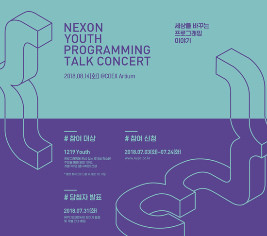 ³Ø½¼Àº ¿À´Â 8¿ù 14ÀÏ ¡®Á¦ 3ȸ ³Ø½¼ û¼Ò³â ÇÁ·Î±×·¡¹Ö 縰Áö 2018(Nexon Youth Programming Challenge, ÀÌÇÏ NYPC)¡¯ÀÇ ¸àÅ丵 ÇÁ·Î±×·¥ ¡®NYPC ÅäÅ©ÄܼƮ¡¯¸¦ ¿°í, ÀÌ¿¡ ¾Õ¼ 7¿ù 24ÀϱîÁö Âü°¡ÀÚ¸¦ ¸ðÁýÇÑ´Ù°í ¹àÇû´Ù.