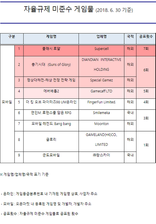 ±× ¹Û¿¡ ¸ð¹ÙÀÏ °ÔÀÓ¹° GAMELAND(HK)CO.,LIMITEDÀÇ ¡®±Û·Î¸®¡¯ ¢ßÆÎ½ºÄ«ÀÌÀÇ ¡®±ºµµ¸ð¹ÙÀÏ¡¯ ÃÑ 2Á¾ °ÔÀÓ¹°ÀÌ ½Å±Ô ¹ÌÁؼö °ÔÀÓ¹°·Î È®ÀεǾî, 2018³â 6¿ù ¸» ±âÁØ ÀÚÀ²±ÔÁ¦ ¹ÌÁؼö °ÔÀÓ¹°Àº ÃÑ 9Á¾ÀÌ´Ù.