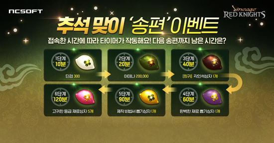 ¿£¾¾(NC)´Â 9¿ù 20ÀϱîÁö ¡¯Á¢¼Ó º¸»ó À̺¥Æ®¡¯¸¦ ÁøÇàÇÑ´Ù. Ãß¼® ¿¬ÈÞ¸¦ ±â³äÇØ ¸¶·ÃµÈ ¼ÛÆí ¾ÆÀÌÅÛ µå¶ø À̺¥Æ®´Ù. ÀÌ¿ëÀÚ´Â 1ÀÏ ´©Àû Á¢¼Ó ½Ã°£(10ºÐ, 20ºÐ, 40ºÐ, 60ºÐ, 90ºÐ, 120ºÐ)¿¡ µû¶ó ¹é»ö, ¾¦»ö, ³ë¶õ»ö µî »ö±ò º° ¼ÛÆí ¾ÆÀÌÅÛÀ» ȹµæÇÒ ¼ö ÀÖ´Ù. ¼ÛÆí »ö±ò¿¡ µû¶ó ¡®´Ü°Ë¡¯, ¡®¾Æµ¥³ª¡¯, ¡®Èñ±Í °¢Àμ® »óÀÚ¡¯ µî ´Ù¾çÇÑ º¸»ó ±¸¼ºÇ°À» È®ÀÎ °¡´ÉÇÏ´Ù. 1ÀÏ ´©Àû Á¢¼Ó ½Ã°£ 120ºÐÀ» ´Þ¼ºÇÏ¸é ¡®°í±ÍÇÑ µî±Þ Àç·á »óÀÚ¡¯µµ ¹ÞÀ» ¼ö ÀÖ´Ù.