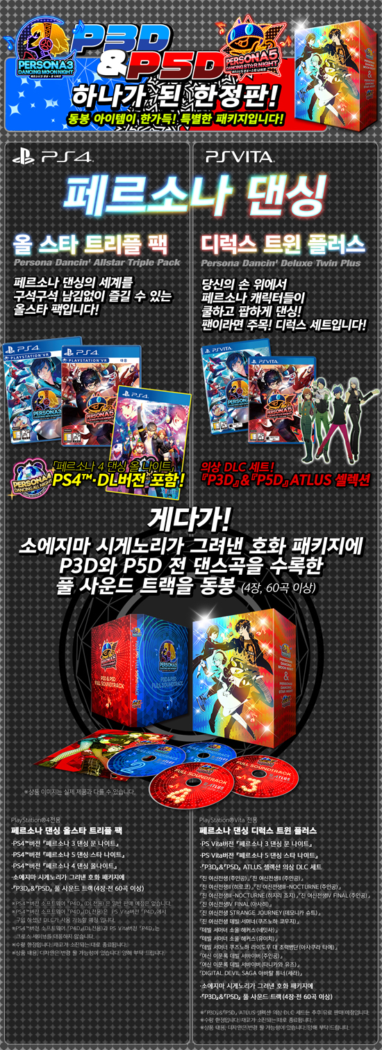 ÀÌ ¿Ü¿¡µµ PS4¢â ÇÑÁ¤ÆÇ¿¡´Â PS4¢â 'Æä¸£¼Ò³ª 4 ´í½Ì ¿Ã ³ªÀÌÆ®' DL¹öÀü, PS Vita ÇÑÁ¤ÆÇ¿¡´Â 'P3D'&'P5D' ATLUS ¼¿·º¼Ç ÀÇ»ó DLC ¼¼Æ® Á¦Ç° Äڵ尡 °¢ÀÚ µ¿ºÀµÈ´Ù.