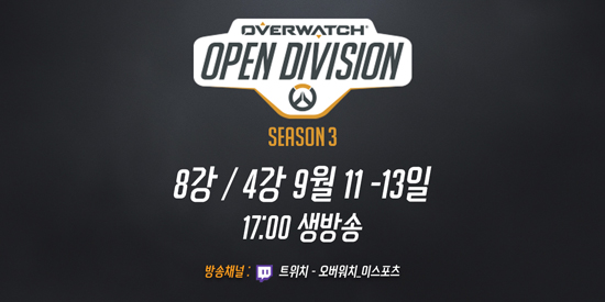 ºí¸®ÀÚµå ¿£ÅÍÅ×ÀÎ¸ÕÆ®ÀÇ ÆÀ ±â¹Ý ¾×¼Ç °ÔÀÓ, ¿À¹ö¿öÄ¡(Overwatch¢ç)ÀÇ °ø½Ä e½ºÆ÷Ã÷ ´ëȸÀÎ ¡®2018 ¿À¹ö¿öÄ¡ ¿ÀÇ µðºñÀü ÄÚ¸®¾Æ(2018 Overwatch¢ç Open Division Korea) ½ÃÁð3¡¯°¡ Ç®¸®±× ¿¹¼±À» ¸¶Ä¡°í 9¿ù 11ÀÏ(È)ºÎÅÍ 17ÀÏ(¿ù)±îÁö º»¼± 8° Ç÷¹ÀÌ¿ÀÇÁ¿¡ µ¹ÀÔÇÑ´Ù.