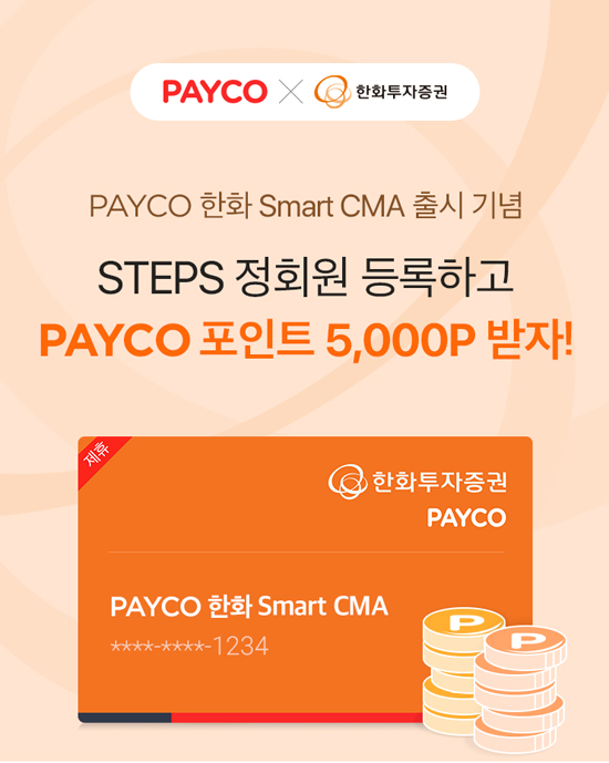 ¾ç»ç´Â Á¦ÈÞ »óǰ Ãâ½Ã¸¦ ±â³äÇØ, 9¿ù 13ÀϺÎÅÍ 10¿ù 31ÀϱîÁö 'ÆäÀÌÄÚ Æ÷ÀÎÆ®'¸¦ Áö±ÞÇÏ´Â À̺¥Æ®µµ ÁøÇàÇÑ´Ù. ¡®PAYCO ÇÑÈ Smart CMA¡¯ °èÁ¸¦ 'ÆäÀÌÄÚ'ÀÇ °£Æí°èÁ·Πµî·ÏÇÑ ÀÌ¿ëÀÚ°¡ ÇÑÈÅõÀÚÁõ±ÇÀÇ °£ÆíÅõÀÚ ¾Û ¡®STEPS(½ºÅܽº)¡¯¸¦ ¼³Ä¡ÇÏ°í °èÁ¸¦ ¿¬°áÇϸé, 5,000 ÆäÀÌÄÚ Æ÷ÀÎÆ®¸¦ Áö±Þ¹ÞÀ» ¼ö ÀÖ´Ù.