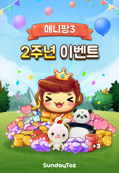 ¼±µ¥ÀÌÅäÁî(´ëÇ¥ ±èÁ¤¼·, www.sundaytoz.com)°¡ ´ëÇ¥ ¸ð¹ÙÀϰÔÀÓ ¡®¾Ö´ÏÆÎ3¡¯ÀÇ Ãâ½Ã 2ÁÖ³âÀ» ±â³äÇØ 10¿ù 2ÀϱîÁö, 2ÁÖ°£ÀÇ ´ëÇü À̺¥Æ®¸¦ ÁøÇàÇÑ´Ù°í 19ÀÏ ¹àÇû´Ù.