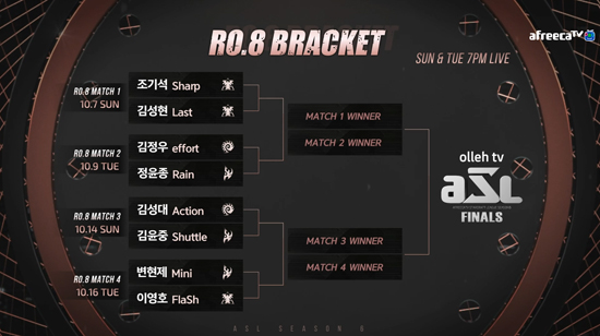 ¾ÆÇÁ¸®Ä«TV´Â 7ÀÏ(ÀÏ) ¿ÀÈÄ 7½ÃºÎÅÍ ¼¿ï ´ëÄ¡µ¿ ÇÁ¸¯¾÷ ½ºÆ©µð¿À¿¡¼ '¾ÆÇÁ¸®Ä«TV ½ºÅ¸¸®±× ½ÃÁð6(ÀÌÇÏ ASL ½ÃÁð6)' 8° 1ÁÖÂ÷ °æ±â¸¦ ÁøÇàÇÑ´Ù°í ¹àÇû´Ù. 8° ÃÖÁ¾ ÁøÃâÇÑ ¼±¼ö´Â Á¶±â¼®(Sharp), Á¤À±Á¾(Rain), ±èÁ¤¿ì(effort), ±èÀ±Áß(Shuttle), º¯ÇöÁ¦(Mini), ±è¼ºÇö(Last), ±è¼º´ë(Action), ÀÌ¿µÈ£(FlaSh)ÀÌ´Ù.