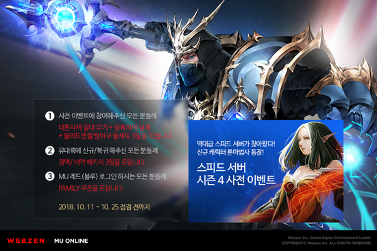 À¥Á¨Àº ¿À´Ã(10¿ù 11ÀÏ) ¡®¹Â ¿Â¶óÀΡ¯ÀÇ ¡®½ºÇÇµå ¼¹ö ½ÃÁð4¡¯ À̺¥Æ® ÆäÀÌÁö¸¦ ¿¾î »çÀü¿¹¾à Á¢¼ö¸¦ ¹Þ°í, Âü°¡ÀÚ Àü¿ø¿¡°Ô ¼±¹°À» ÁÖ´Â À̺¥Æ® ³»¿ëÀ» ¾È³»Çß´Ù. ¡®½ºÇÇµå ¼¹ö¡¯´Â Á¤½Ä ¼¹ö¿¡ ºñÇØ °æÇèÄ¡´Â 3¹è ÀÌ»ó, ¾ÆÀÌÅÛ È¹µæ È®·üÀº 10¹è·Î ³ô°Ô Á¶Á¤µÈ ¼¹ö·Î ij¸¯Å͸¦ ÃÖ´ë 700·¹º§±îÁö ºü¸£°Ô À°¼ºÇÒ ¼ö ÀÖ´Ù.