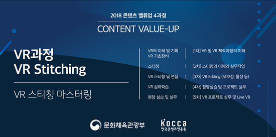 Ä¿¸®Å§·³Àº VR ¿µ»ó Á¦ÀÛ ºÐ¾ß Áß¼Ò±â¾÷ ÀçÁ÷ÀÚ¿Í ÇÁ¸®·£¼ÀÇ ½Ç¹« ¿ª·® °È¸¦ ¸ñÀûÀ¸·Î ±¸¼ºµÈ´Ù. ¡ãVR ÄÜÅÙÃ÷ ±âȹ ¡ã½ºÆ¼ÄªÀÇ ÀÌÇØ¿Í ½Ç¹«ÀÛ¾÷(Autopano Video Pro) ¡ãVR ¿¡µðÆÃ(»öº¸Á¤, ÇÕ¼º) µî ½ºÆ¼Äª ¸¶½ºÅÍ °úÁ¤À» °ÅÃÄ ¡ãVR ÃÔ¿µ½Ç½À ¡ã°ÔÀÓ¿£Áø°úÀÇ Çù¾÷ ½Ç¹« ¹× Live VR µî Çù¾÷ ½Ç¹« °úÁ¤À¸·Î À̾îÁö´Â 5Â÷ ±³À° ÇÁ·Î±×·¥ÀÌ ÁøÇàµÈ´Ù.