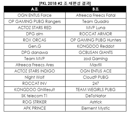 ÆàÁöÁÖ½Äȸ»ç°¡ ¡®KT 10 GiGA internet PUBG KOREA LEAGUE 2018 #2(KT 10 ±â°¡ ÀÎÅÍ³Ý ÆàÁö ÄÚ¸®¾Æ ¸®±× 2018 ÇϹݱâ / ÀÌÇÏ PKL 2018 #2)¡¯ Á¶ ÀçÆí¼º °á°ú¸¦ 29ÀÏ ¹ßÇ¥Çß´Ù. ½Å±Ô Á¶ Æí¼ºÀº 29ÀÏ ½ÃÀ۵Ǵ 5ÁÖÂ÷ À§Å¬¸® ¸ÅÄ¡(Weekly Match)ºÎÅÍ Àû¿ëµÈ´Ù.