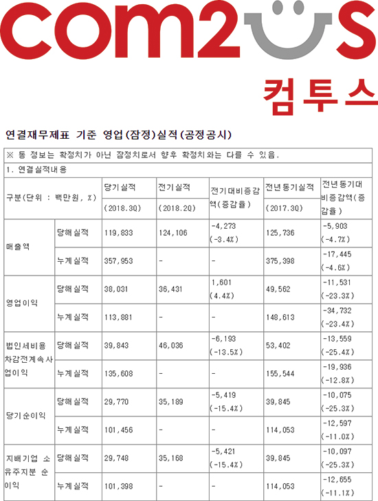 ÄÄÅõ½º´Â 11¿ù 7ÀÏ ½ÇÀû¹ßÇ¥¸¦ ÅëÇØ 2018³â 3ºÐ±â ¸ÅÃâ 1,198¾ï ¿ø, ¿µ¾÷ÀÌÀÍ 380¾ï ¿ø, ´ç±â¼øÀÌÀÍ 298¾ï ¿øÀ» ´Þ¼ºÇß´Ù°í ¹àÇû´Ù.