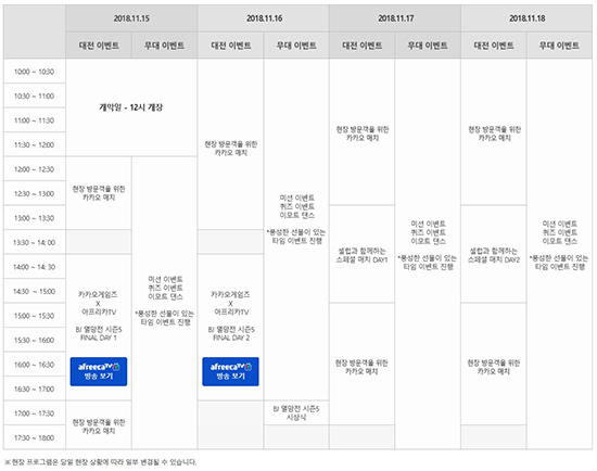 Áö½ºÅ¸ 1, 2ÀÏÂ÷ÀÎ 11¿ù 15Àϰú 16ÀÏ ÀÌÆ² µ¿¾ÈÀº À¯¸í BJ°¡ Á÷Á¢ Âü¿©ÇÏ´Â ¡®¾ÆÇÁ¸®Ä«TV BJ ¸ê¸ÁÀü ½ÃÁð5¡¯ ÆÄÀ̳Π°æ±â¸¦ Á÷Á¢ ÁøÇàÇÑ´Ù. ÁÖ¸»ÀÎ 11¿ù 17ÀÏ¿¡´Â Àαâ BJ ºí·¢¿öÅ©, ÁÖ¾ÈÄÚ¸®¾Æ, ÆÄÀÌ, ¸ÀÁ¾¿íÀÌ, 18ÀÏ¿¡´Â ¹æ¼ÛÀÎ À¯º´Àç, Á¤¸íÈÆ, ¹®»óÈÆ, À¯±Ô¼± µî ÃÑ 8ÀÎÀÇ ¼¿·´°ú ÇÔ²²ÇÏ´Â ½ºÆä¼È ¸ÅÄ¡°¡ ¿¸°´Ù.