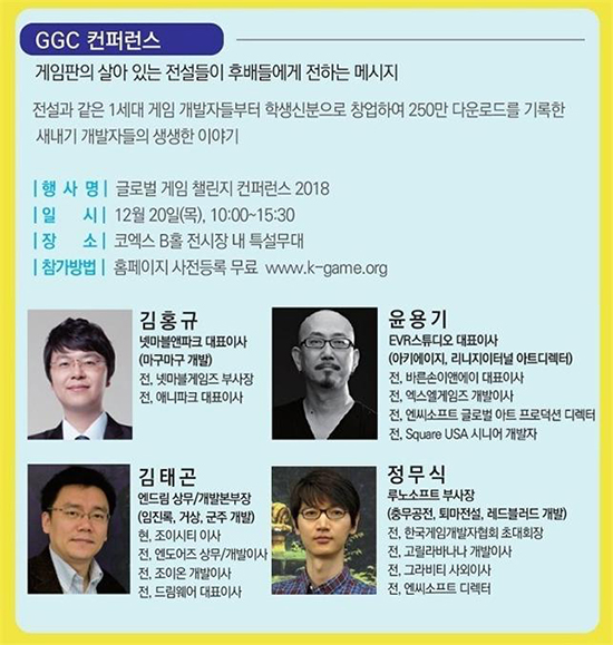 »ì¾Æ ÀÖ´Â Àü¼³·Î ºÒ¸®´Â °ÔÀÓ¾÷°è °ÅÀåµéÀÌ ÈÄ¹è °ÔÀÓÇеµµéÀ» À§ÇØ ¶æÀ» ¸ðÀ¸°í ÇÑ ÀÚ¸®¿¡ ¸ðÀδÙ. ¿À´Â 20ÀÏ, ÄÚ¿¢½º¿¡¼´Â Àü±¹ °ÔÀÓ°ü·Ã ´ëÇÐ ¹× Çаú ¿¬ÇÕ Æä½ºÆ¼¹ú ¡®±Û·Î¹ú °ÔÀÓ Ã§¸°Áö(GGC) 2018¡¯ Çà»ç°¡ °³ÃֵȴÙ. GGC 2018 °³¸·À» ±â³äÇØ ¿¸®´Â ÄÜÆÛ·±½º¿¡ ±èÅÂ°ï ¿£µå¸² »ó¹«, ±èÈ«±Ô ³Ý¸¶ºí¾ØÆÄÅ© ´ëÇ¥, À±¿ë±â EVR½ºÆ©µð¿À ´ëÇ¥, Á¤¹«½Ä ·ç³ë¼ÒÇÁÆ® ºÎ»çÀå µîÀÌ °»ç·Î Âü¿©ÇÑ´Ù.
