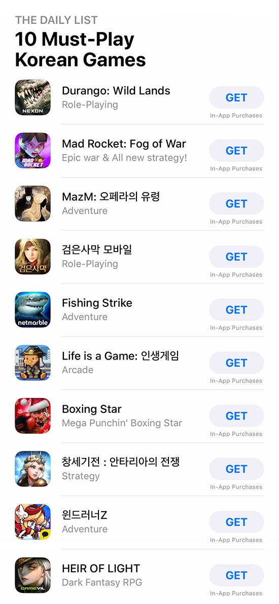 ³×½Ã»ï½Ê»ïºÐ(ÀÌÇÏ 4:33)ÀÌ ¼ºñ½º ÁßÀÎ ¸ð¹ÙÀÏ °ÔÀÓ ¡®º¹½Ì½ºÅ¸¡¯¿Í ¡®¸Åµå·ÎÄÏ: Æ÷±× ¿Àºê ¿ö¡¯°¡ ¾ÖÇà ¾Û½ºÅä¾îÀÇ ¡®²À Áñ°ÜºÁ¾ß ÇÒ 10´ë Çѱ¹ °ÔÀÓ¡¯¿¡ ¼±Á¤µÆ´Ù.