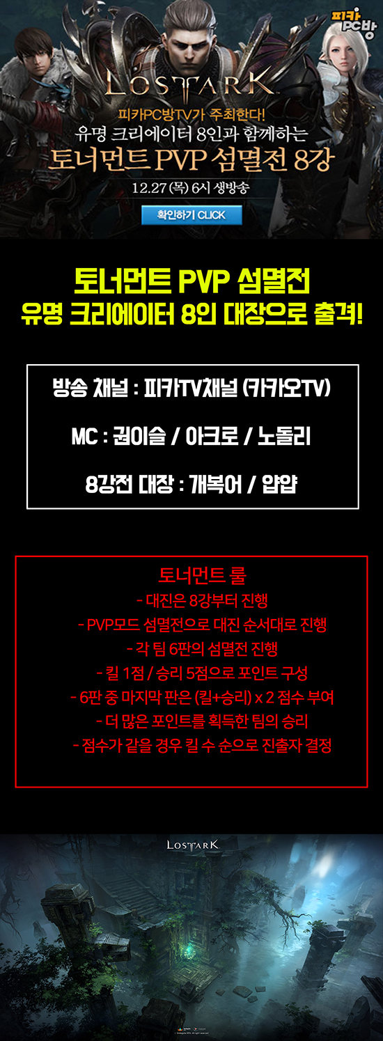 ÇÇÄ« PC¹æÀÇ °ø½Ä ¶óÀÌºê¹æ¼Û ÇÇÄ«TV¿¡¼ ÁÖÃÖÇÏ´Â ¡®ÇÇÄ«TV ·Î½ºÆ®¾ÆÅ© õÇÏÁ¦ÀÏ PVP ´ëȸ¡¯°¡ 12¿ù 27ÀÏ ¸ñ¿äÀÏ ¿ÀÈÄ 6½Ã īī¿ÀTV ³» ¡®ÇÇÄ«TV °ø½Ää³Î¡¯¿¡¼ »ý¹æ¼ÛÀ¸·Î ÁøÇàµÈ´Ù.