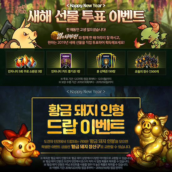 ¡®¼±¹° ÅõÇ¥¡¯ À̺¥Æ®¡¯´Â À¯ÀúµéÀÌ °¡Àå ¹Þ°í ½ÍÀº º¸»ó¿¡ ÅõÇ¥¸¦ ÇÏ°í °¡Àå ¸¹Àº Ç¥¸¦ ¹ÞÀº º¸»óÀ» ¼±¹°ÇÏ´Â ¹æ½ÄÀÌ´Ù. ÀÎÇÇ´ÏÆ¼ 5ȸ ¹«·á ¼Òȯ±Ç 3Àå, ÀÎÇÇ´ÏÆ¼ Ä«µå »Ì±â±Ç 1Àå, È¥ ¼±ÅÃ±Ç 150Àå, ÃÊ¿ùÀÇ Á¤¼ö 7,500°³°¡ Èĺ¸¿¡ ¿Ã¶ú´Ù. ¡®ÃÊ¿ù Ä®¸®µ·¡¯ À̺¥Æ®´Â 2019³â Ȳ±ÝµÅÁö ÇØ¸¦ ¸Â¾Æ ÃÊ¿ù Ä®¸®µ·ÀÌ È²±Ý µÅÁö·Î º¯°æµÇ°í º¸»óµµ »óÇâµÈ´Ù. ¡®È²±Ý µÅÁö µå¶ø¡¯ À̺¥Æ®´Â µµÀüÀÚ ´øÀü¿¡¼ ¸ó½ºÅ͸¦ óġÇÏ¸é ¡®È²±Ý µÅÁö¡¯¸¦ ¾òÀ» ¼ö Àִµ¥, ±³È¯¼Ò¿¡¼ ÀÌ È²±Ý µÅÁö¸¦ ´Ù¾çÇÑ ¾ÆÀÌÅÛÀ¸·Î ±³È¯ÇÒ ¼ö ÀÖ´Ù. ´õºÒ¾î ÀÎÇÇ´ÏÆ¼ Ä«µå ȹµæ ½Ã, ÃÖ´ë 3ȸ ±îÁö ´Ù¸¥ ÀÎÇÇ´ÏÆ¼ Ä«µå·Î º¯°æÇÒ ¼ö ÀÖ´Â ¡®ÀÎÇÇ´ÏÆ¼ Ä«µå Àç¼Òȯ¡¯ À̺¥Æ®µµ ÁøÇà ÁßÀÌ´Ù.